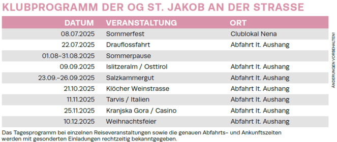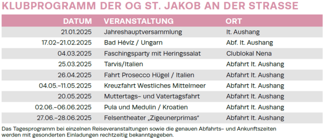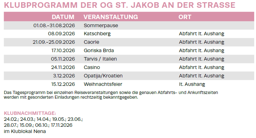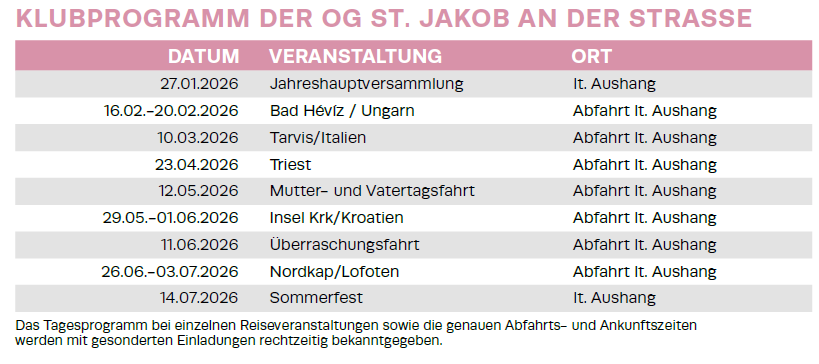 "Die Mitglieder der Ortsgruppe St. Jakob an der Straße sind jung dynamisch und reisefreudig! Unsere Aktivitäten sind dementsprechend ausgerichtet."