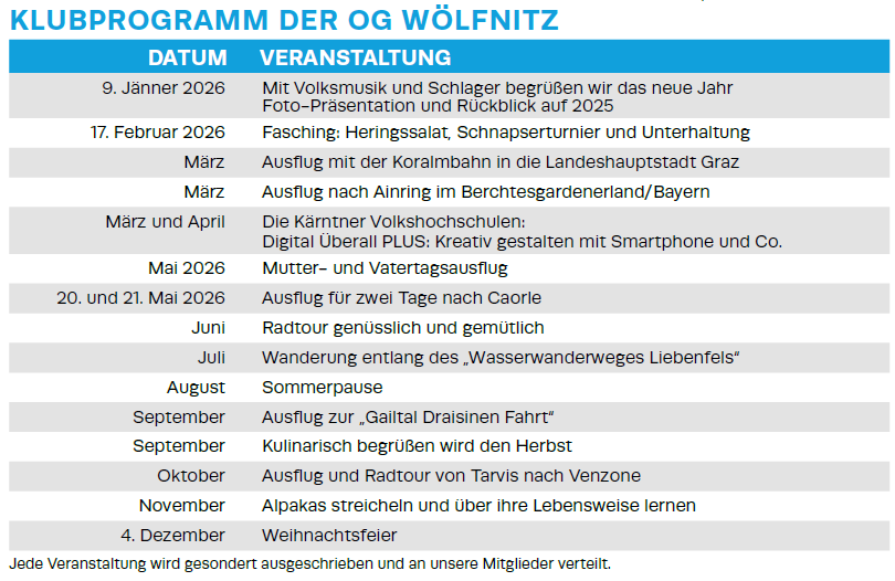 "Viele neue Veranstaltungen lassen die Mitglieder der Ortsgruppe Wölfnitz erblühen. Wir freuen uns auf wunderbare gemeinsame Stunden."