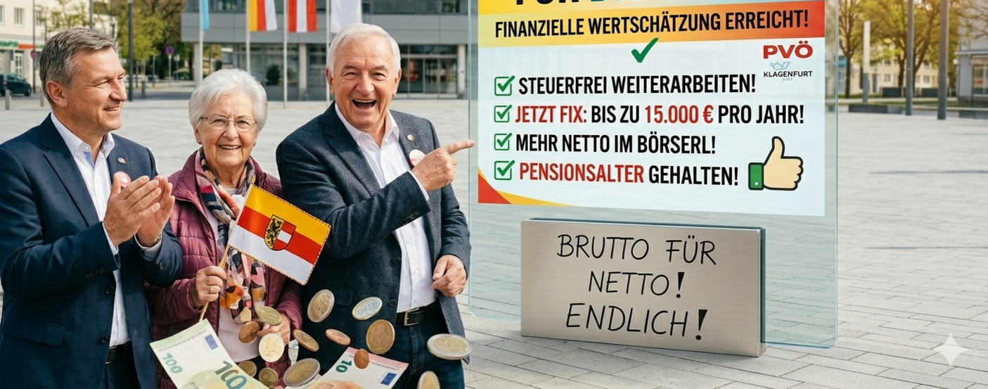 - Weniger Sozialversicherungsbeiträge durch Entfall der Pensionsversicherungsbeiträge der ArbeitnehmerInnen zum Paket „Arbeit im Alter“ der Bundesregierung hat der PVÖ Klagenfurt Stadt durch seine VetreterInnen mit Hartnäckigkeit, Konsequenz und Argumentationskraft beigetragen. Mehr Netto im Börserl ist die Folge und auch die Erhöhung des Pensionsantrittsalters konnte abgewendet werden.