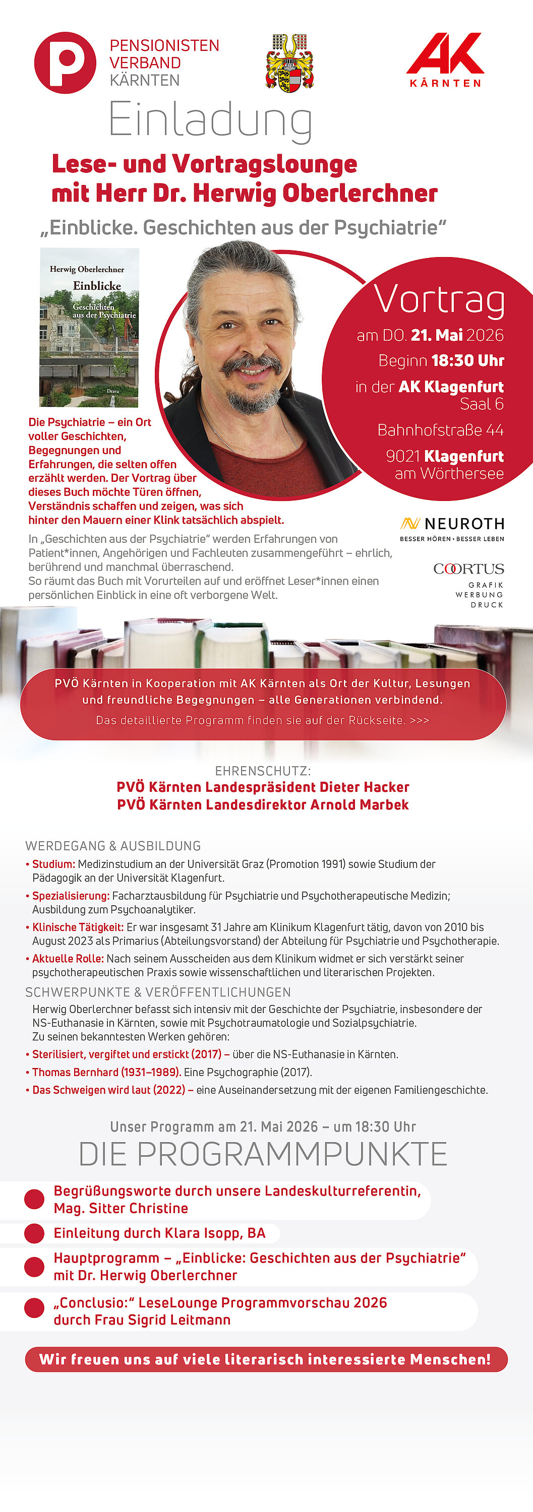 Am Donnerstag, den 21. Mai 2026, präsentiert Dr. Herwig Oberlerchner im Saal 6 der AK Klagenfurt sein Werk „Einblicke. Geschichten aus der Psychiatrie“. In diesem Buch führt der erfahrene Mediziner Erfahrungen von Patient*innen, Angehörigen und Fachleuten zusammen – ehrlich, berührend und oft überraschend.