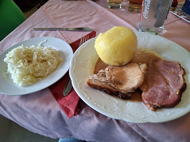 Nach der Wanderung ließen wir den Tag beim traditionellen Schweinsbratenessen im Gasthof Gressl am Hilmanger ausklingen. Hier kamen noch einmal rund 50 weitere Mitglieder und Freunde dazu, sodass sich insgesamt eine große, fröhliche Gemeinschaft einfand.