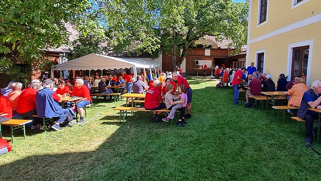 Start und Ziel war im Garten des Pfarrhofes, wo wir dann unsere Gäste auch bewirteten. Im Lauf des Vormittags fanden sich auch zahlreiche Ehrengäste ein, die von Bezirksvorsitzenden Hans Wurm herzlich begrüßt wurden.