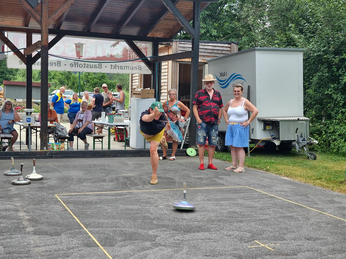 Wie im vergangenen Jahr konnten wir – trotz Unwetterwarnung und Hitzeankündigung – Ende Juni unser vierteljährliches Treffen am wieder aktivierten Stockschützenplatz abhalten. Unsere Hobbykonditorinnen zauberten Torten, fürs Gulasch war es an diesem Tag beinahe zu heiß. Das Ehepaar Schwarz versorgte uns mit den kühlen Getränken der Stockschützen.