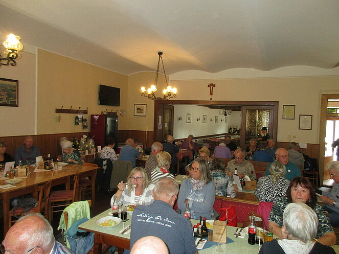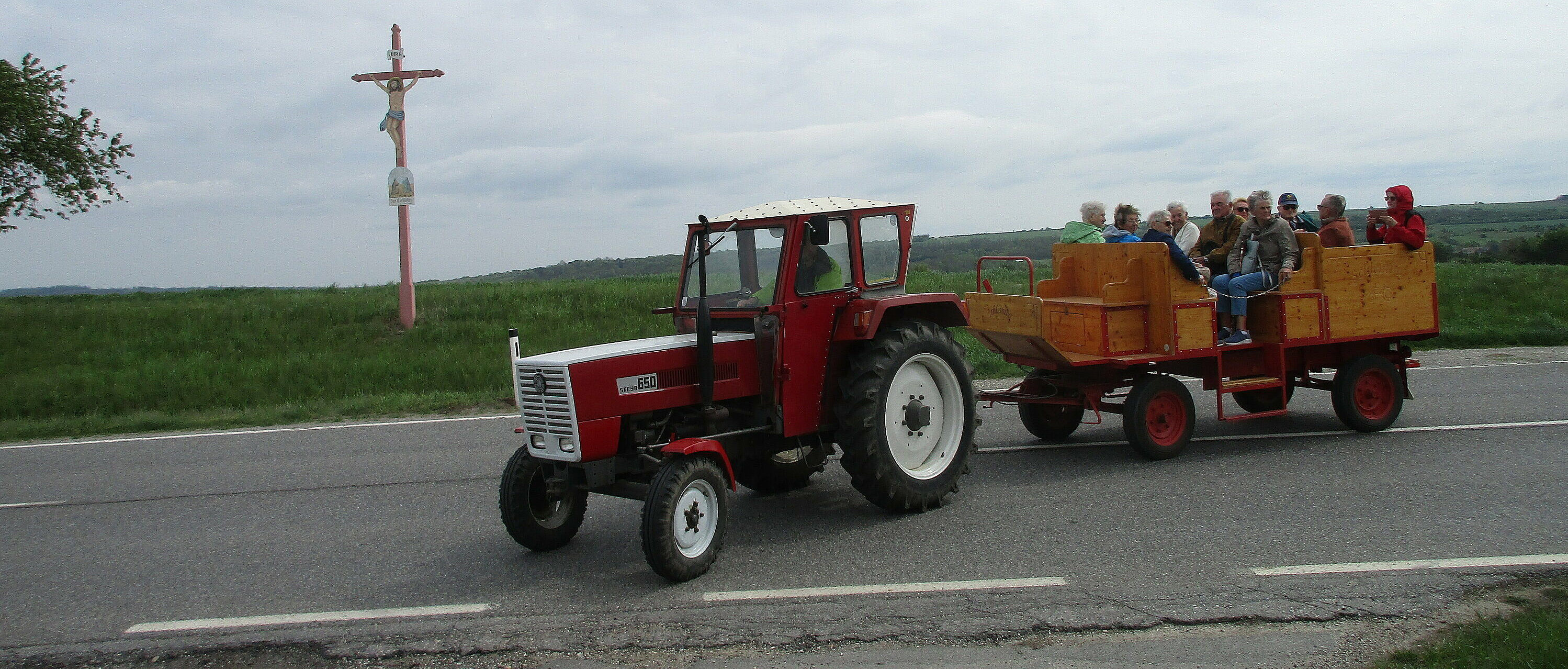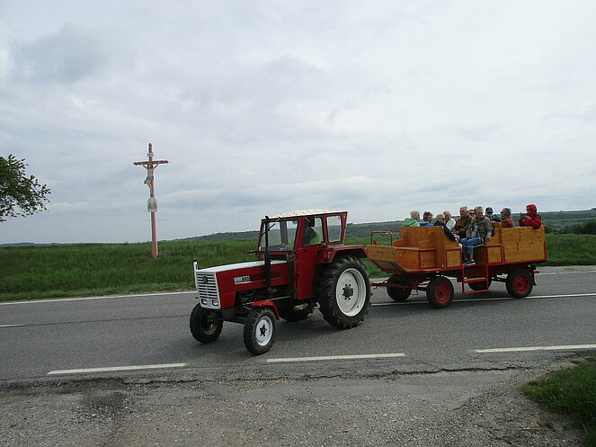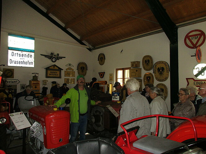 Mit dem Traktor ging es anschließend zum Mittagessen beim Dorfwirt in Klein Schweinbarth. Nach dem Mittagessen fuhr man mit den Trktoren, nach einem Aufenthalt am Kreuzberg zurück ins Museum, wo durch einen weiteren Teil der Sammlung geführt wurde.