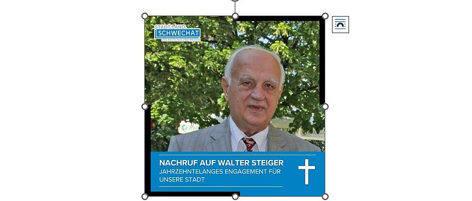 Die Stadtgemeinde Schwechat wird Walter Steiger als geschätzten Menschen, gewissenhaften Gestalter und echtes Vorbild in ehrender Erinnerung behalten.