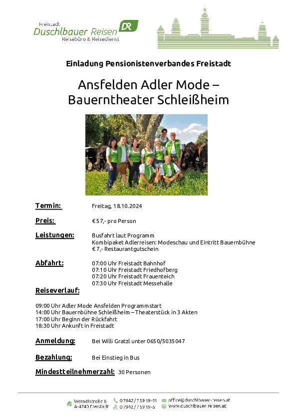 Der Pensionistenverband Ortsgruppe Freistadt lädt zu einem Tagesausflug nach Ansfelden ADLER-Mode und weiter zum Bauerntheater Schleißheim ein.