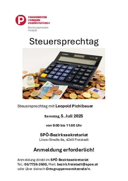 Am Samstag, 5. Juli 2025 organisiert der Pensionistenverband wieder einen Steuersprechtag.