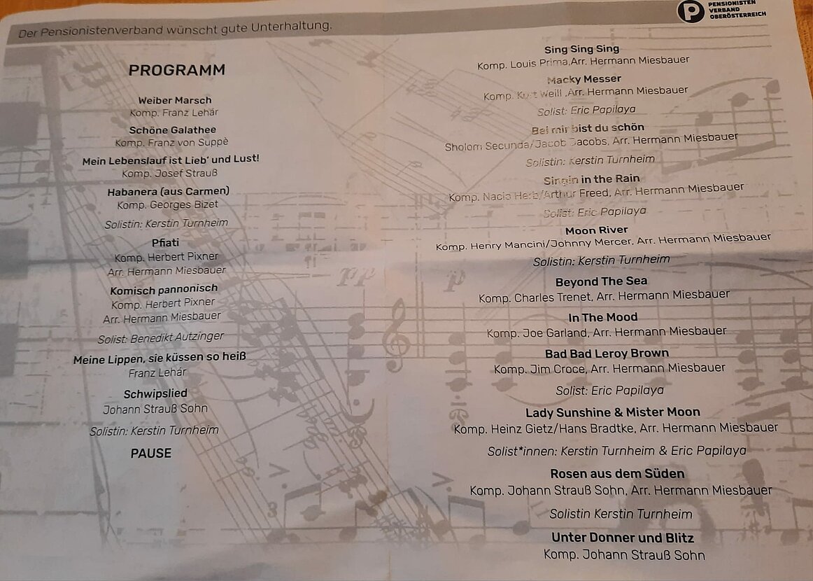 Unter den zahlreichen Ehrengästen des Neujahrskonzertes befanden sich unter anderem Pensionistenverbands-Präsidentin Birgit Gerstorfer, PVOÖ-Landespräsident Norbert Höpoltseder, Vizekanzler und Kulturminister Andreas Babler, PVÖ-Generalsekretär Christian Rösner El Heliebi sowie Landesrat Martin Winkler.