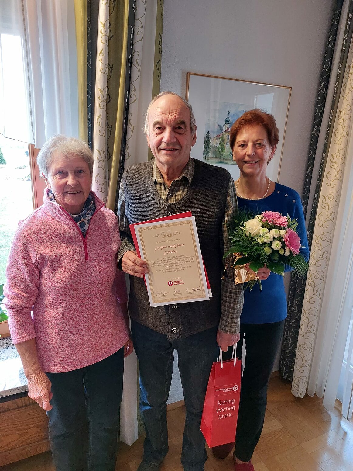 PVÖ Vorsitzender Manfred Wurm und Subkassierin Rosa Walser gratulierten dem Jubelpaar, überreichten ein Geschenk und Blumen und wünschten für die Zukunft viel Gesundheit und noch viele gemeinsame, glückliche Jahre.