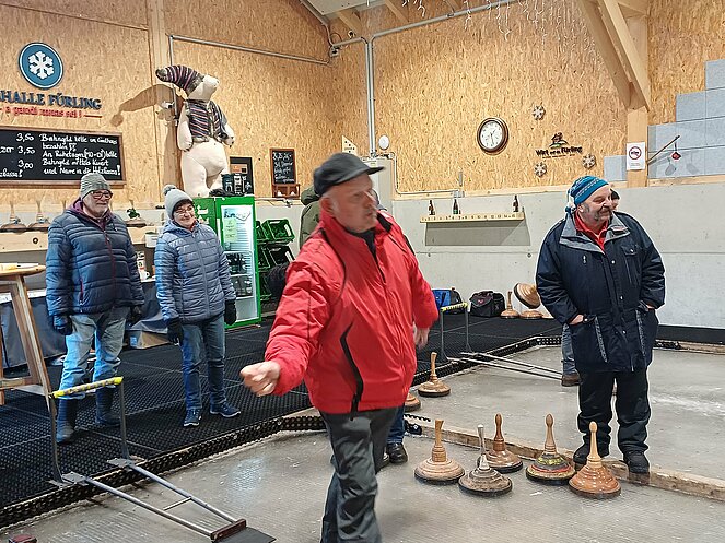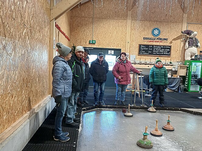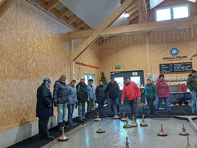 Kein Stäubchen Schnee, kein Natureis- wie gut, dass es die Eishalle in Fürling gibt!!! Und wie, gut, dass Hermann rechtzeitig eine Bahn für uns reservierte! Mit sportlichem Ehrgeiz, viel Spaß und kleinen Naschereien verging die Zeit wie im Flug und nach zwei Stunden stellte sich eine siegreiche Gruppe heraus. Traditionell wurde dann das Essen- köstlich: “Gebackenes Allerlei”- bezahlt. Am Ende gab es nur Gewinner und die Erkenntnis, dass gemeinsamer Sport verbindet, Freude macht und das zufriedenstellende Gefühl, Sinnvolles und Frohes mit liabe Leit' getan zu haben!