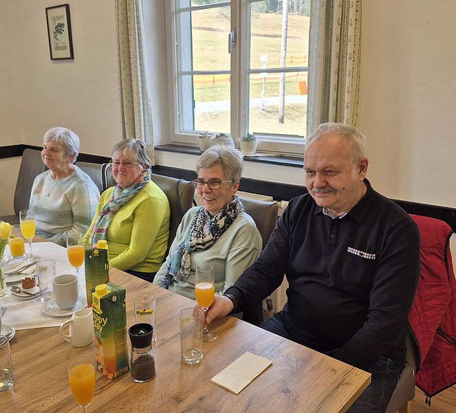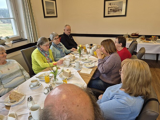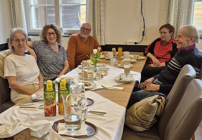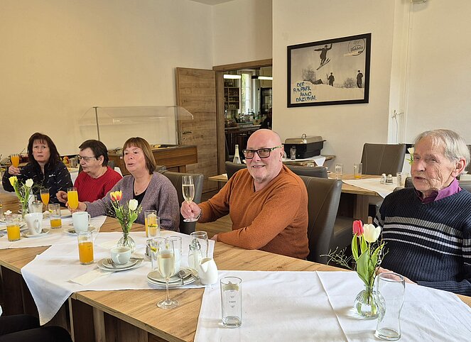 Zu diesem Frühstück gesellte sich eine gemütliche Gruppe und wir konnten im Stüberl wieder eine feine Zeit miteinander verbringen. Das Buffet war einmal mehr hervorragend- und, weil grad heute Erwin Geburtstag hatte, ergab sich eine fröhliche Gratulation. Die- schon vorbestellte- Nusstorte schmeckte köstlichst, danke, Sabine, da ist dir Tolles gelungen! Ein Glaserl Frizzante ließ den Vormittag gur ausklingen!