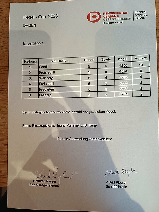 Und unsere Damen…….gewannen- ungeschlagen- den Cup 2026, vor Freistadt II und Wartberg!!! 😀🏆👏🏻 Obwohl sie erst zum zweiten Mal dabei waren, gelang ihnen dieser Coup! Teilweise war es wie ein Krimi, in der Dingdorfer Stub'n etwa entschied Sandl in der letzten Runde um FÜNF! Kegeln das Spiel für sich. Die Freistädter Damen hatten wohl 66 Kegeln insgesamt mehr, jedoch konnten unsere Damen mit allen gewonnenen Spielen sehr verdient den Sieg für sich beanspruchen!