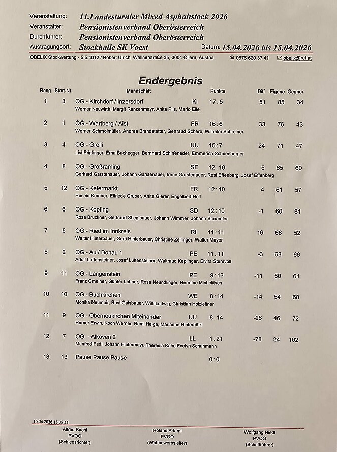 Am 2. Spieltag des PVÖ Asphaltstock-Landesturniers im Mixed-Bewerb, ausgetragen im Stocksportzentrum des SK Voest in Linz, zeigte die Mannschaft aus Wartberg ob der Aist eine starke Leistung.