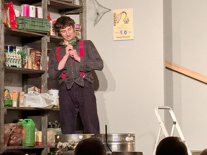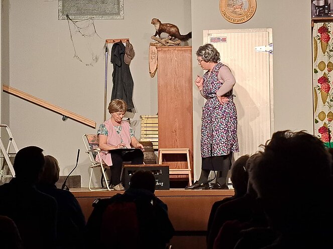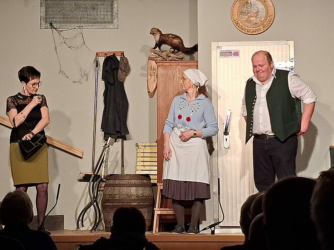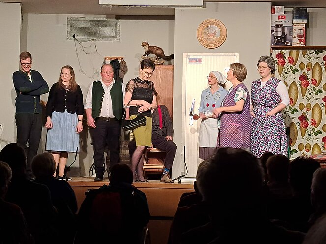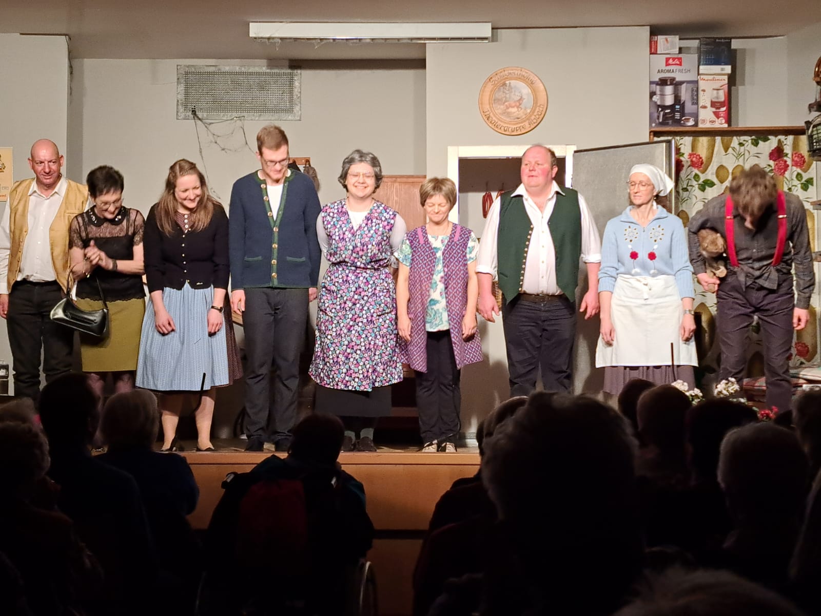 Der Titel des diesjährigen Stückes verheißte nichts Gutes! Mucks Mäuserl Mord! Rote Gummistiefel! Das war das Auffälligste, das dieser seltsame Gast anhatte, der am Abend zuvor in der Gaststube vom „Roten Raben“ saß. Und niemand fand ihn sympathisch. Weder die neue Kellnerin, der eifernde Schankbursch, der geschäftstüchtige Dorfwirt, noch dessen resolute Schwester. Und nun war der ominöse Gast verschwunden. Die Pfarrersköchin Mucki und Mesnerin Mausi, die im Vorratskeller der Dorfwirtschaft eigentlich nichts zu suchen haben, entdecken unter anderem die Gummistiefel und riechen Mord. Der Detektivsinn ist geweckt. Und die Liste der verdächtigen Personen wird noch länger. Aber, psst, immer mucksmäuschenstill, sonst scheucht man den Mörder auf. So weit zum Inhalt. Nach allerhand Wendungen löste sich schlussendlich alles in Wohlgefallen auf! Im Anschluss an das nervenaufreibende Stück konnten wir uns im „Alfons“ mit gutem Essen beruhigen.