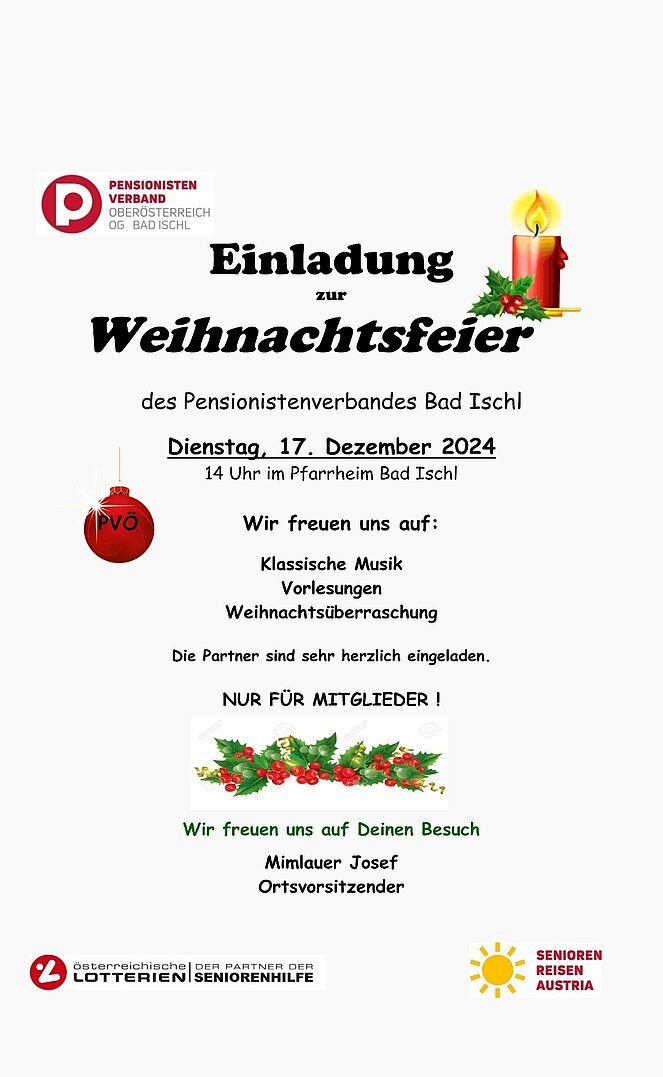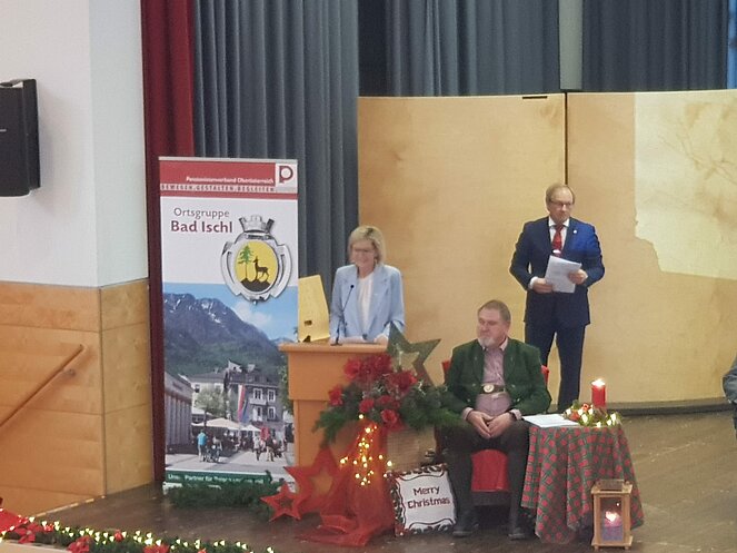 Am 17. Dezember lud der Pensionistenverband Bad Ischl seine Mitglieder zur Weihnachtsfeier. Gleich beim Betreten des Saales kam Stimmung auf durch die feierliche, stillvolle Dekoration. Durch das Programm begleitete der Opernsänger Klaus Kuttler mit seinem Männergesangsverein Altmünster und ein paar Solostück von ihm selbst gesungen. Jörg Zeppezauer umrahmte das Programm mit einigen lieben und lustigen Weihnachtsgedichten. Auch die Ehrengäste bekundeten Ihre Wünsche zu Weihnachten und dem neuen Jahr. Mit einer Einlage der Glöcklerzwerge aus Pfandl wurde die Veranstaltung geschlossen und man unterhielt sich noch ausgiebig und verabschiedete sich untereinander mit den besten Wünschen zu Weihnachten. Wieder ist ein Kalenderjahr mit vielen schönen gemeinsamen Erlebnissen zu Ende gegangen, man wünscht sich Gesundheit, Harmonie und Lebensfreude für das kommende neue Jahr, auf das wir noch ganz viel Schönes und Lustiges in der Gemeinschaft erleben dürfen.