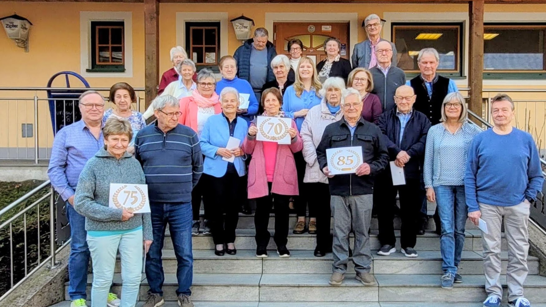Nach einer kurzen Willkommensrede wurde den Gratulanten mit einem Glas Prosecco und 2 Altmünsterer Gutscheinen gratuliert. Nach einem gemeinsamen Foto mit unseren Geburtstagskindern überraschte uns Höller H.Peter mit dem Lied " oben Gute Laune, unten......." , wobei jeder im Saal mitmachte.
