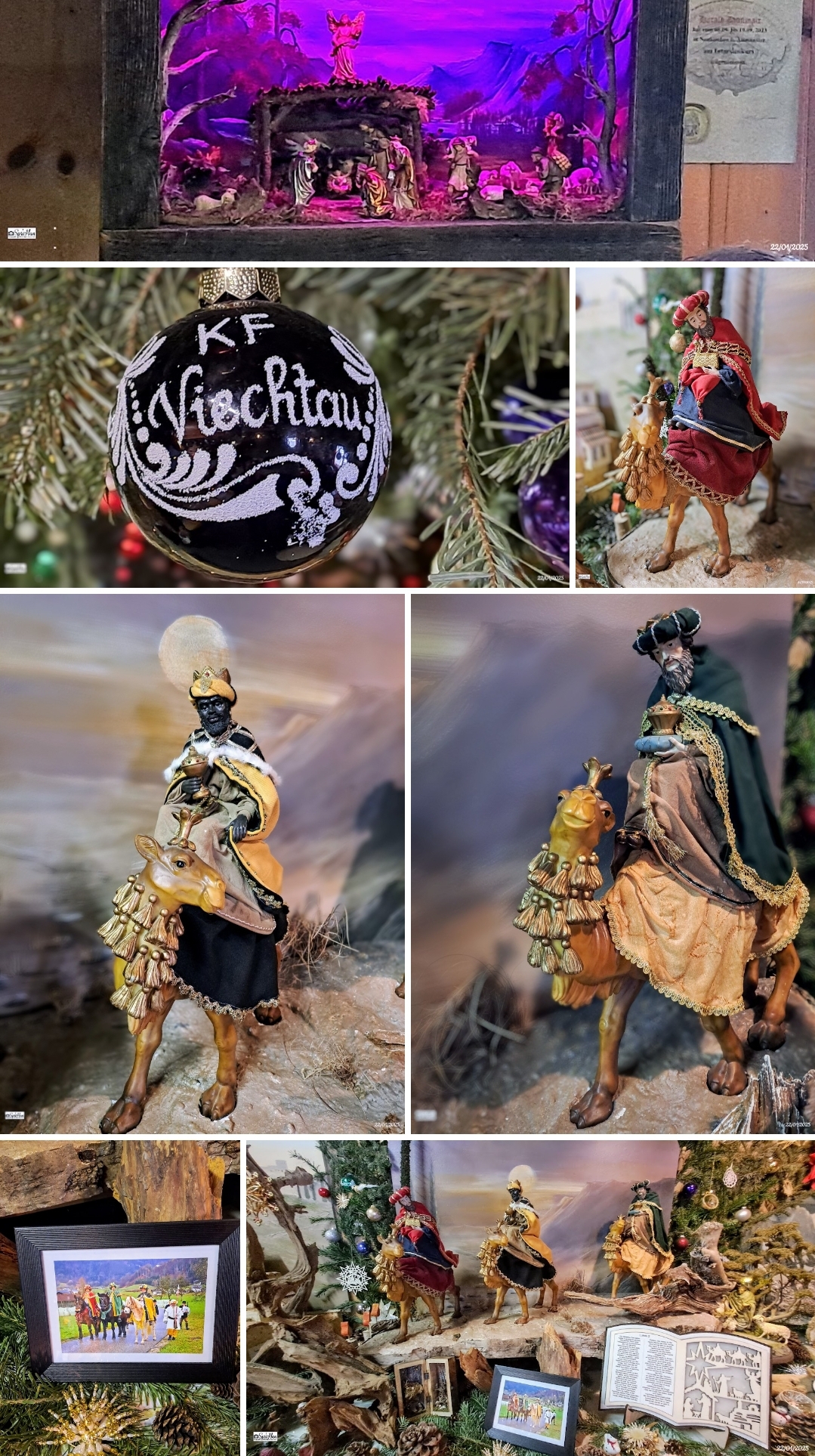 Jedes Jahr am 23. Dezember beginnen Sie mit dem Aufstellen der Krippen, schmücken hierzu eine eigene Hütte an der Decke mit Tannenreisig und mittlerweilen 1.200 Christbaum Kugeln. Eine Besonderheit heuer ist die Ausstellung unserer "3 Viechtauer Königsreiter" , ( https://www.facebook.com/share/p/15edG5mFqx/ ) geschmückt in geschneiderten Original Gewändern. Die Figuren sind ungefähr 30cm hoch und wurden in stundenlanger Arbeit hergestellt.