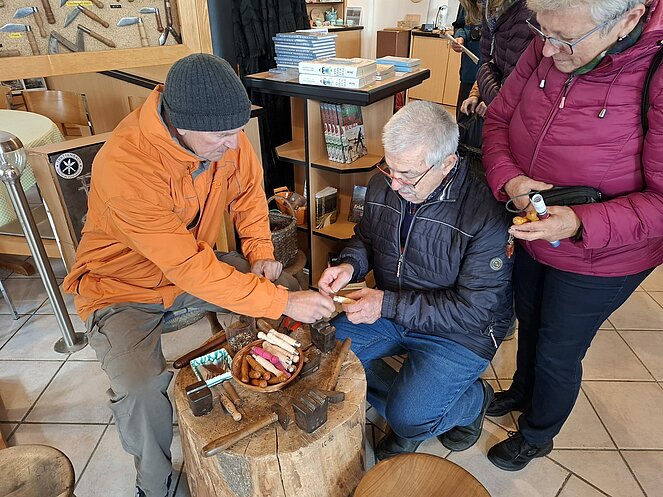Dies war die Geburtsstunde eines Messers, das für viele über Generationen hinweg zum Inbegriff des Messers wurde, das tausende Herzen in Baumrinden verewigt. Jeder von uns konnte an den Schleifsteinen und Hämmern Platz nehmen, um sich in die Arbeiter der Feitelmacher hinein versetzen zu lassen. Am Ende unserer Führung konnte sich jeder sein eigenes Feitel machen und mit Namen gravieren.