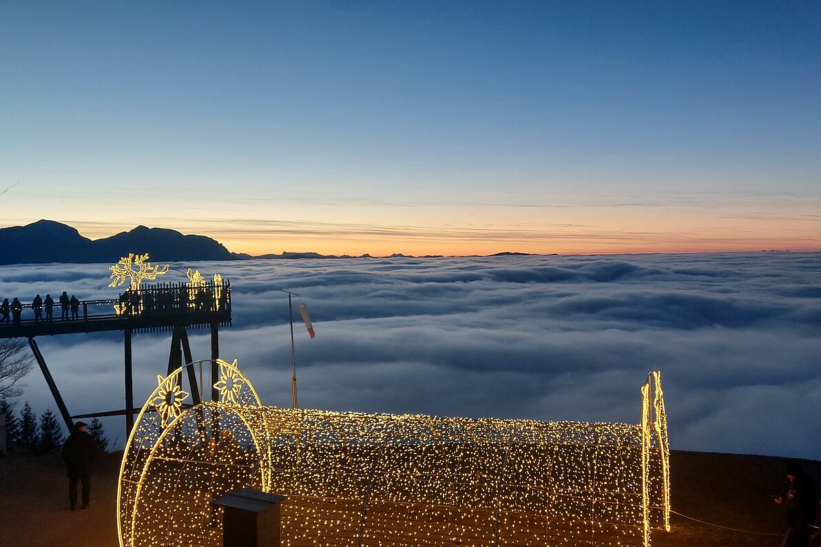 Dem Nebel entfliehen, sich bewegen, den Sonnenuntergang miterleben und viele, viele Lichter am Grünberg genießen. Am Sonntag Nachmittag machte sich die Wandergruppe vom GH Hain auf den Weg zum Grünberg auf - zeitgleich genossen einige die Fahrt mit der Gondel, um plötzlich aus dem Nebenmeer aufzutauchen und das Ambiente des Lichterzaubers zu genießen.
