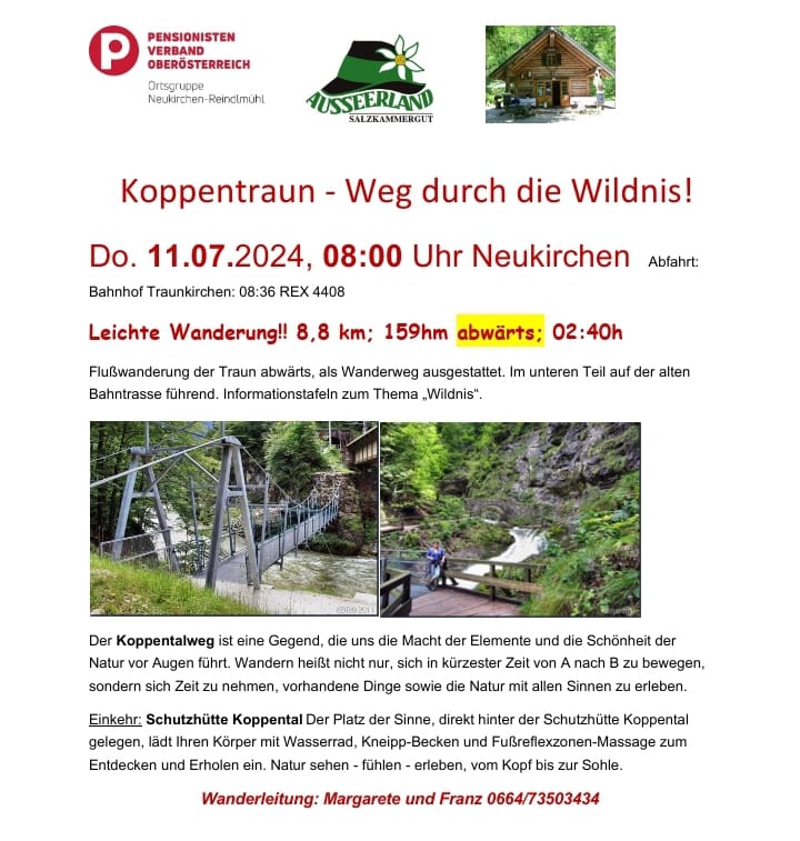 Entlang der Koppentraun wanderten wir bei schönen Wetter rund 9 Kilometer durch eine herrliche Landschaft. Bei einem kurzen Stopp in der "Schützhütte Koppental" , wo wir eine Jause zu uns nahmen, konnten wir uns von der Hitze ein wenig erholen, bevor es wieder weiter ging.