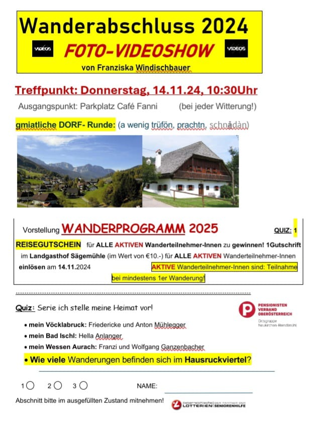 Zum Abschluss unseres Wanderprogramms sind wir eine 5 km lange Runde gegangen. Im Anschluss fand im GH "Sägemühle" die Schlussveranstaltung statt. Mit einem Foto-Video Beitrag von Franziska Windischbauer vom abgelaufenen Jahr und Gruß-und Dankesworte unseres Wanderleiters Franz Spiessberger wurde das Wanderjahr 2024 beendet.