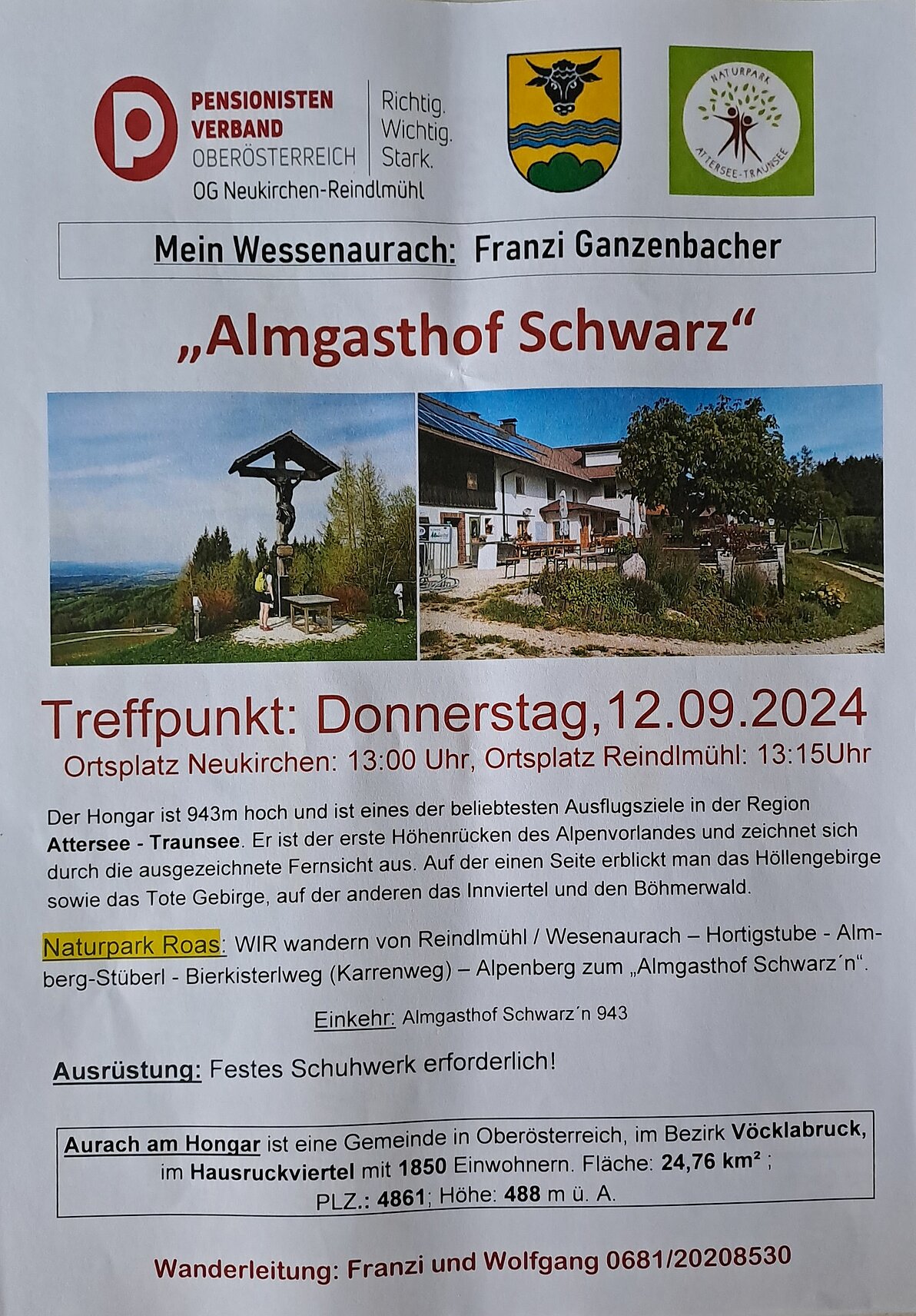 Unter der ortskundigen Leitung von Franzi Ganzenbacher gingen wir den Rundwanderweg am Gahberg. Bei der Gahbergkirche angekommen machten wir uns wieder auf den Rückweg Richtung Reindlmühl (Kasten). Zum Abschluss des Wandertages bekamen wir bei Franzi G. eine köstliche Gulaschsuppe serviert.