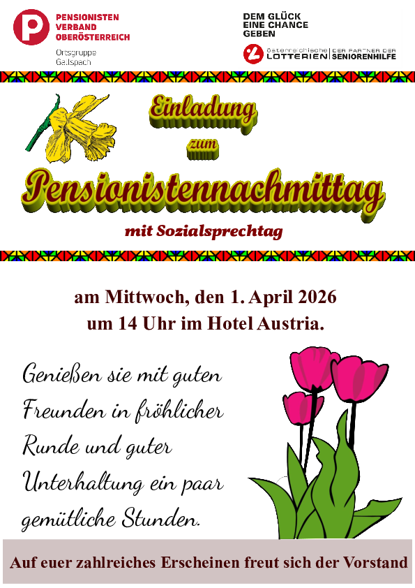 Pensionistennachmittag mit Sozialsprechtag ab 14 Uhr, Hotel Austria.