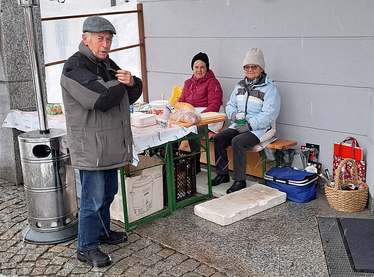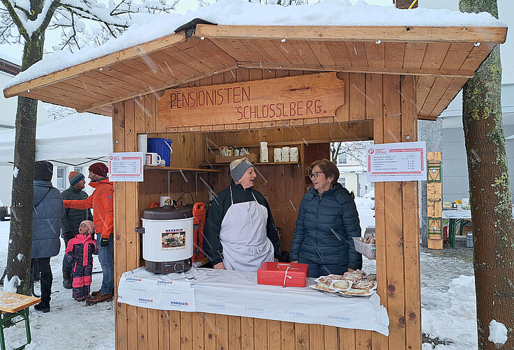 Der Pensionistenverband war beim Adventmarkt auf dem weihnachtlich verschneiten Marktplatz wieder mit einem Stand und einer Maronibraterei vertreten.