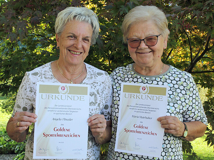 Die Seniorengymnastik in der OG Schlüßlberg feiert Jubiläum. Vor zwanzig Jahren wurde sie von Angela Flixeder und Maria Mairhuber ins Leben gerufen. Mit viel Einsatz besorgten sie damals bei Sponsoren die erforderlichen Utensilien, wie Bälle und dergleichen. Vieles bastelten sie gemeinsam mit anderen Mitgliedern selbst. Seither turnen sie ununterbrochen vor. Für ihren großen Beitrag zur Erhaltung der Gesundheit unserer Mitglieder wurden sie mit dem Goldenen Landessportehrenzeichen ausgezeichnet. Wir gratulieren dazu ganz herzlich!