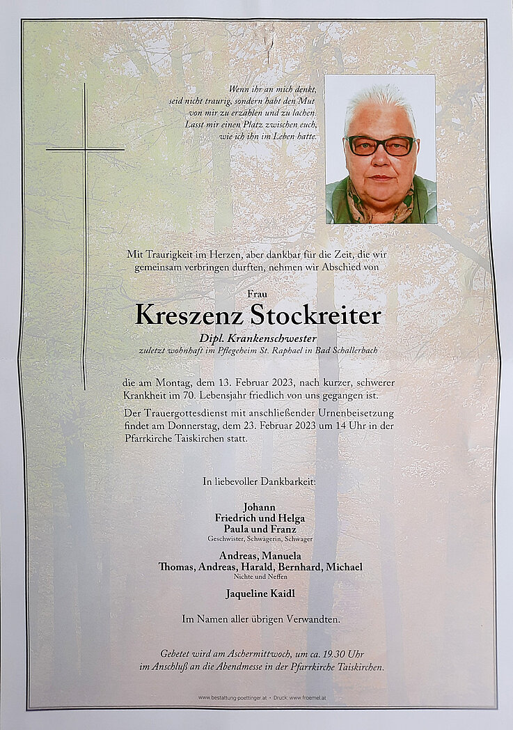Wir trauern um unser Mitglied Kreszenz Stockreiter