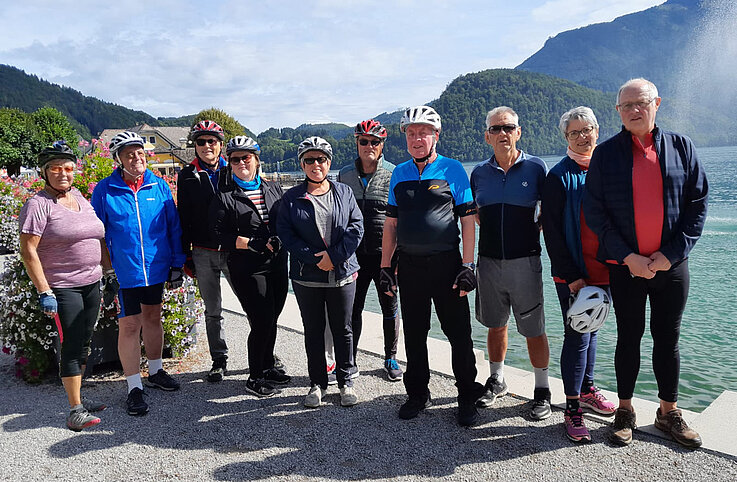 Bei leichtem Regen hatten wir unsere Räder verladen und bei strahlendem Sonnenschein konnten wir unsere 3-Seen-Radtour in Unterach am Attersee starten. Die Tour führte auf dem Radweg entlang des Mondsees bis Scharfling, an der Scharflinger Höhe und am Krotensee vorbei nach St. Gilgen, wo wir bei einem Strandkaffee unsere erste Pause einlegten. Weiter ging es entlang des Wolfgangsees bis Strobl, weiter entlang der Ischl nach Bad Ischl. Im Restaurant Elisabeth wurden wir ausgezeichnet verköstigt und und weiter ging unser Radausflug entlang der Traun nach Mitterweißenbach durchs Weißenbachtal zu unserem Startplatz in Unterach. Die Tour wurde sehr rücksichtsvoll und umsichtig von Koll. Hermann Oberauer angeführt.