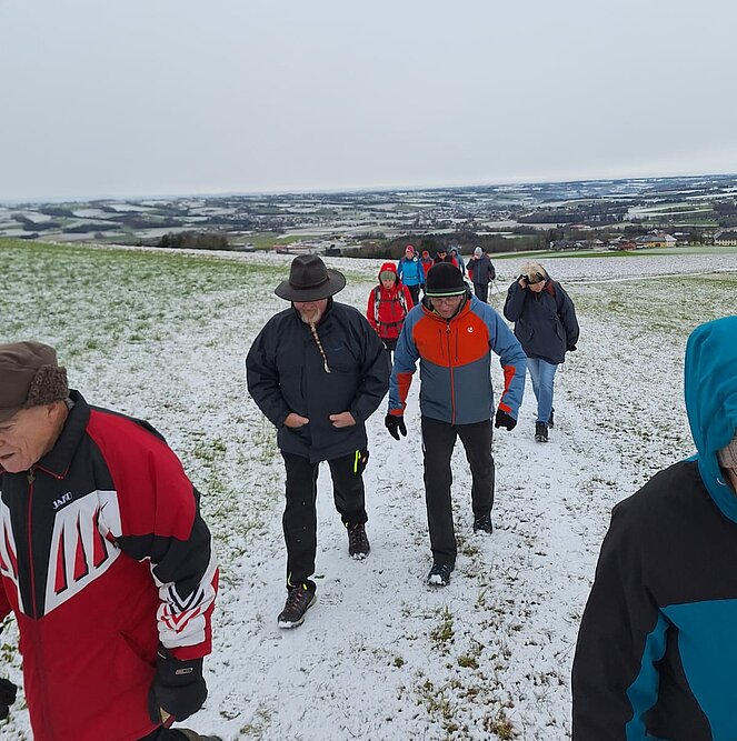 Unsere letzte Wanderung des Jahres führte uns heuer von der Jageredt Richtung Hochkogel nach Schlierbach. Bei leichtem Schneefall machten sich 18 Wanderfreunde auf den Weg und kamen nach etwa 2 Stunden beim Gasthaus Schröcker an. Dort warteten schon viele unserer Mitglieder, um gemeinsam zu essen und zu feiern. Wir wurden mit sehr gutem Essen verwöhnt. Sepp Schoißwohl und Hans Wasserbauer haben uns mit Musik und Witzen unterhalten.