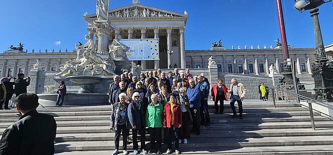 Am 16. Oktober 2025 unternahmen wir einen Tagesausflug nach Wien. Unser erster Programmpunkt war das Parlamentsgebäude. Bei einer geführten Tour erhielten wir spannende Einblicke in die Geschichte und Architektur des Hauses sowie in die Abläufe der österreichischen Demokratie. Besonders beeindruckend war der historische Sitzungssaal und die prachtvolle Säulenhalle. Wir freuten uns sehr über das persönliche Treffen mit den beiden Nationalratsabgeordneten Reinhold Binder und Katrin Auer, die sich Zeit für ein Gespräch nahmen. Anschließend stärkten wir uns im Restaurant Einstein. Am Nachmittag machten wir einen Spaziergang am Wiener Zentralfriedhof. Dort begegneten wir den Namen berühmter Persönlichkeiten, die hier ihre letzte Ruhestätte gefunden haben – darunter Ludwig van Beethoven, Falco und Udo Jürgens. Die parkähnliche Anlage und die herbstliche Stimmung machten den Rundgang zu einem besonderen Erlebnis.