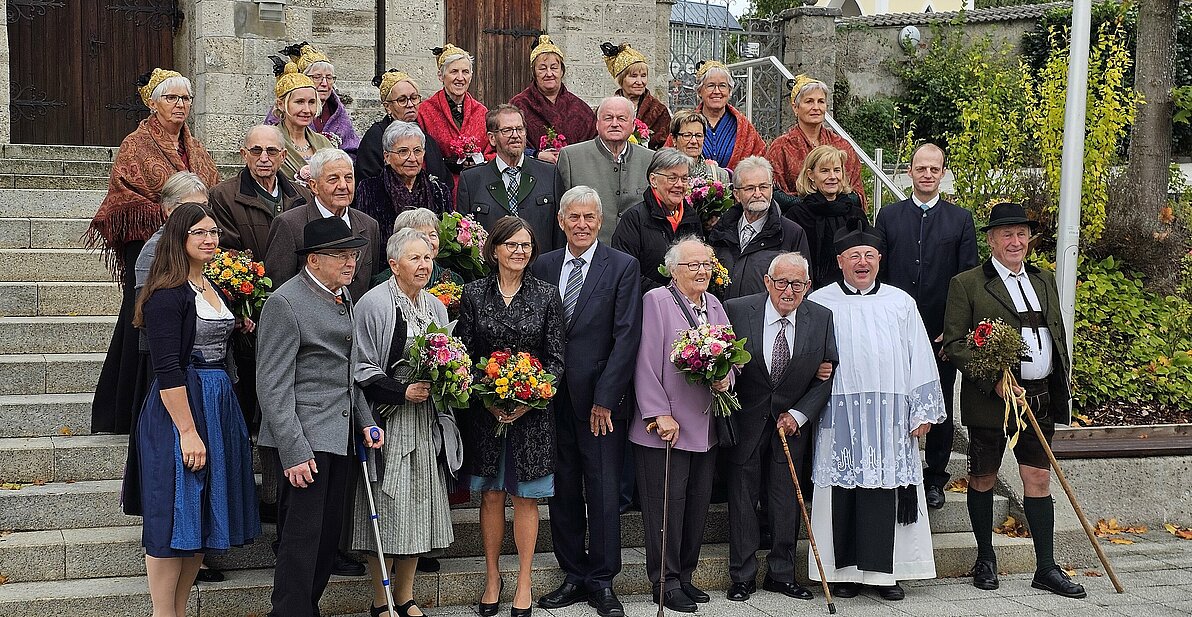 Acht Nußbacher Jubelpaare trafen sich am Sonntag, 5. Oktober 2025 in der Pfarrkirche Nußbach, um ihre besonderen Ehejubiläen zu feiern. Mit einem Oldtimer-Bus fuhren alle ins Gasthaus Genuss Schmied’n, wo bei einem guten Essen, Kaffee und Kuchen noch einige gemütliche und festliche Stunden verbracht wurden.