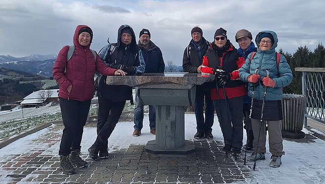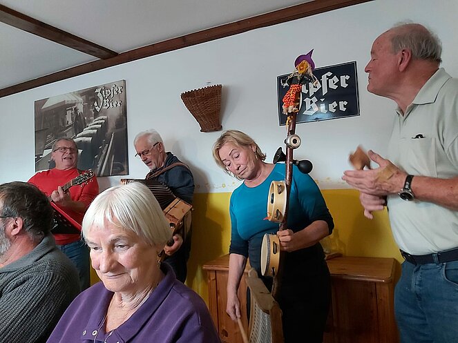 Unsere letzte Wanderung des Jahres führte uns zur Jausenstation Weiß’n am Sattel. Trotz des trüben Wetters und der kühlen Temperaturen ließen sich unsere Wanderlustigen nicht entmutigen. Der Rest legte die Strecke mit dem Auto zurück. Insgesamt 43 Teilnehmer wurden mit herzhaftem Schweinsbraten, Knödel und Kraut verwöhnt. Hans spielte uns mit seinen Kollegen einige Stücke zum Mitsingen und Schunkeln. Wir verbrachten ein paar sehr gemütliche Stunden.