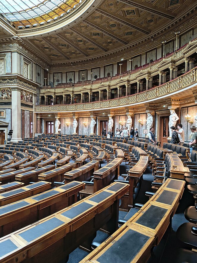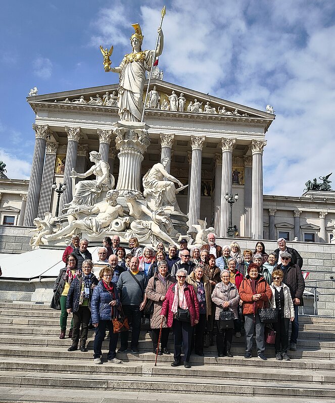 Mit dem Busunternehmen Weiermair waren 44 Mitglieder unterwegs nach Wien um das neue Parlament zu besichtigen. Dieses wunderschöne Gebäude wurde beeindruckend renoviert und auf den neuesten Stand der Technik gebracht. Von der Säulenhalle, gings dann in die Sitzungsäle, der historische Sitzungssaal hat es allen angetan, aber auch die neuen Säle sind wunderschön. Im Anschluß gings zum Mittagessen zum Schnitzelwirt. Gestärkt machten wir uns auf den Weg nach Melk zum Benediktinerstift. Wir gingen durch die interessante Ausstellung, weiter in den Marmorsaal, dann auf die Terrasse mit wunderschönem Rundblick und dann noch in einige Räume der Bibliothek und zum Schluss noch in die Kirche. Nach diesen 2 tollen Führungen machten wir uns auf den Heimweg. Ein wunderschöner Ausflug ging zu Ende.