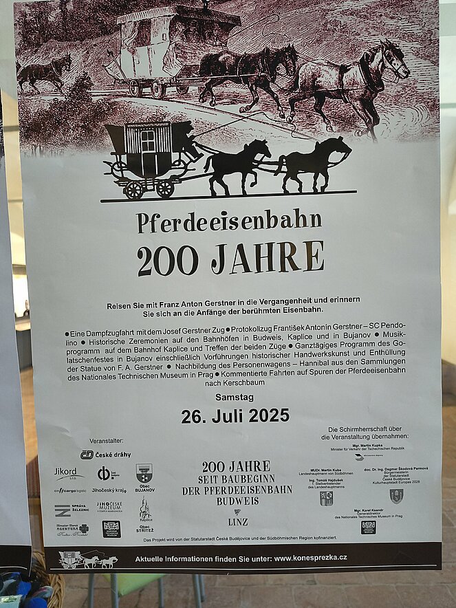 Die zwischen 1827 und 1836 abschnittsweise eröffnete Pferdeeisenbahn Budweis–Linz–Gmunden war die zweite öffentliche Eisenbahnlinie auf dem europäischen Festland und diente hauptsächlich dem Transport von Salz aus dem oberösterreichischenSalzkammergut nach Böhmen. In den Jahren 1855 und 1856 wurde sie zwischen Linz und Gmunden auf Dampfbetrieb umgestellt. Der Pferdebahnbetrieb wurde im Dezember 1872 eingestellt. (aus Wikipedia)