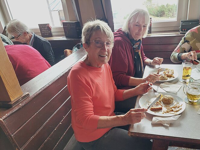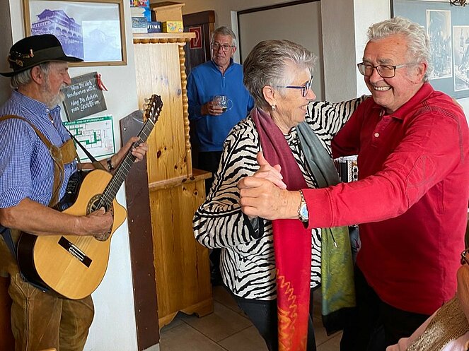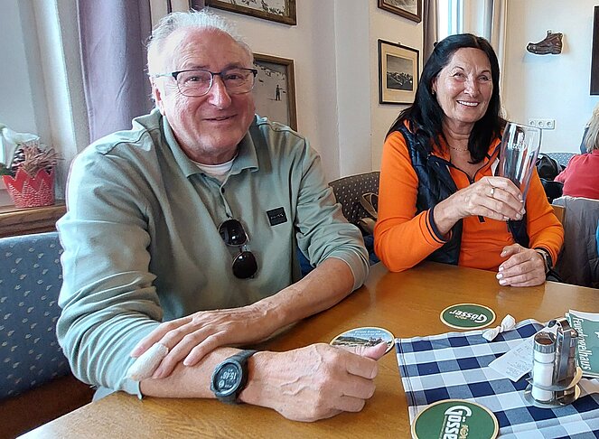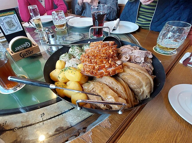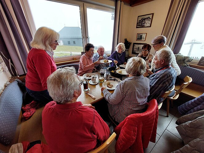 Im Feuerkogelhaus angekommen, wurden wir kulinarisch verwöhnt: Das traditionelle „Bratl in der Rein“ ließ keine Wünsche offen und jederzeit wurde auch ein Nachschlag serviert. Für die musikalische Unterhaltung sorgte das Duo Maria & Heli, das mit seiner Musik für ausgelassene Stimmung und beste Laune unter den Teilnehmern sorgte. Um 17 Uhr traten wir, zufrieden nach einem abwechslungsreichen Tag, die Heimreise an.