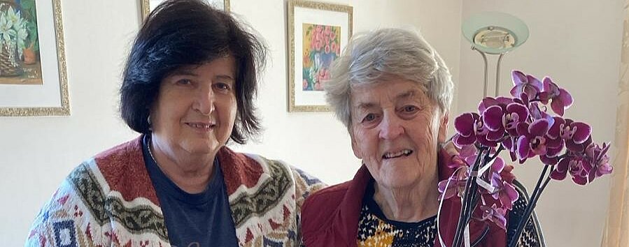 Unsere Helga servierte unseren Gratulantinnen eine ausgezeichnete, sehr saftige Sachertorte. Auch mit 85 Jahren und einem Rollator zur Unterstützung ist sie immer noch eine ausgezeichnete Mehlspeisenköchin und so verbrachten alle einen sehr gemütlichen Geburtstagsbesuch.