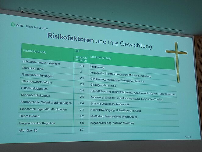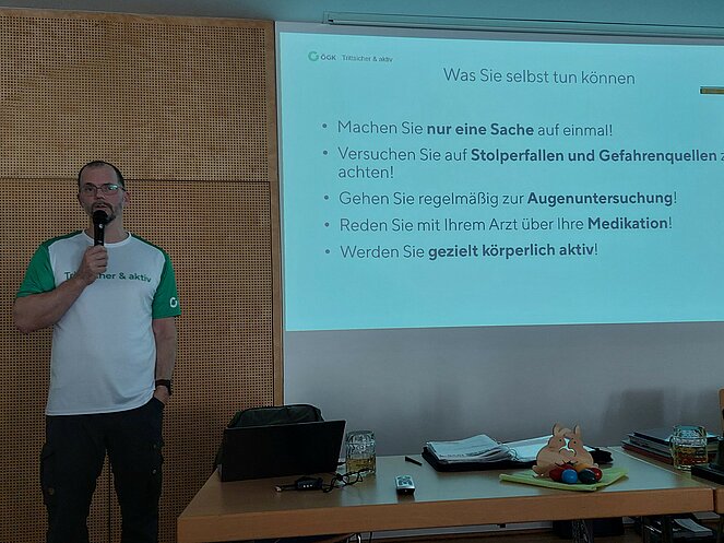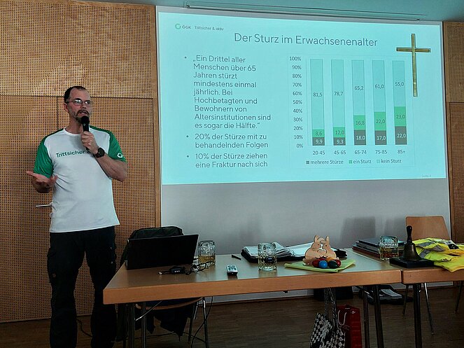 Stürze stellen gerade in unserem Alter eine alltägliche Gefahr dar und können in den unterschiedlichsten Situationen auftreten. Oft reicht schon ein kurzer Moment der Unachtsamkeit: Sei es, dass ein Teppichrand oder eine Stufe übersehen wird – solche Missgeschicke sind vielen von uns schon passiert. In seinem Vortrag hat unser Referent sowohl auf typische Stolperfallen hingewiesen als auch verschiedene Lösungswege aufgezeigt, wie man sich vor Stürzen besser schützen kann. Manche unserer 80 Besucher nutzten die Gelegenheit, um über eigene Fehleinschätzungen und Erfahrungen nachzudenken. Zusätzlich informierte Herr Mag. Jansenberger über das Programm der Gesundheitskasse „Trittsicher und aktiv“. Es besteht die Absicht, ein solches Vorsorgeprogramm auch bei uns zu starten, um aktiv etwas für unsere Sicherheit zu tun.