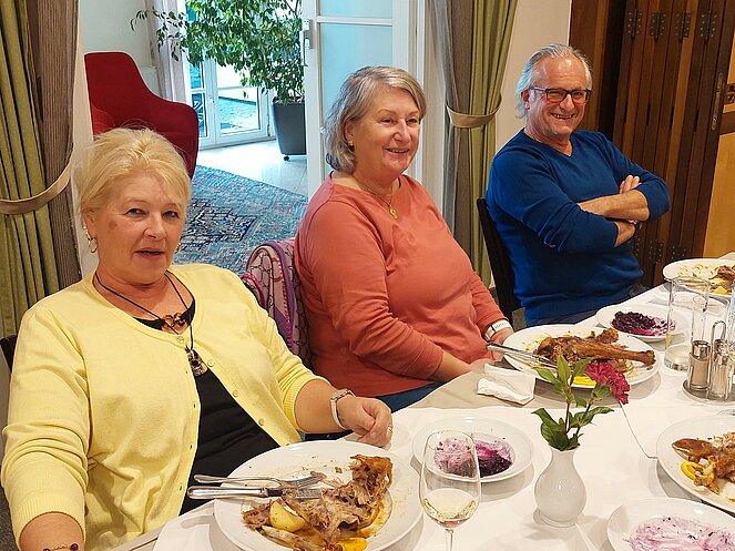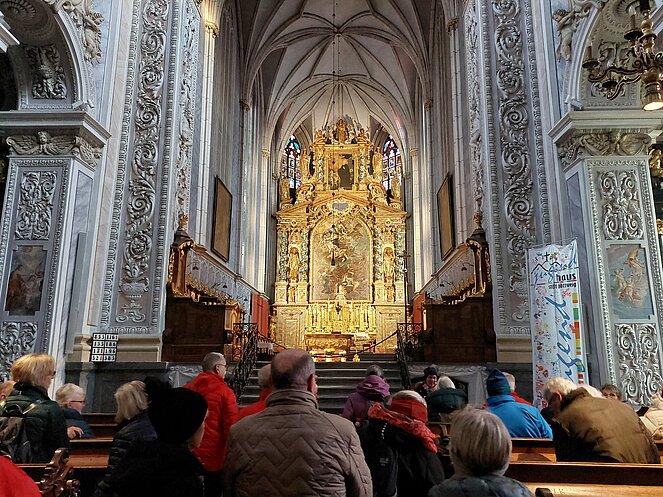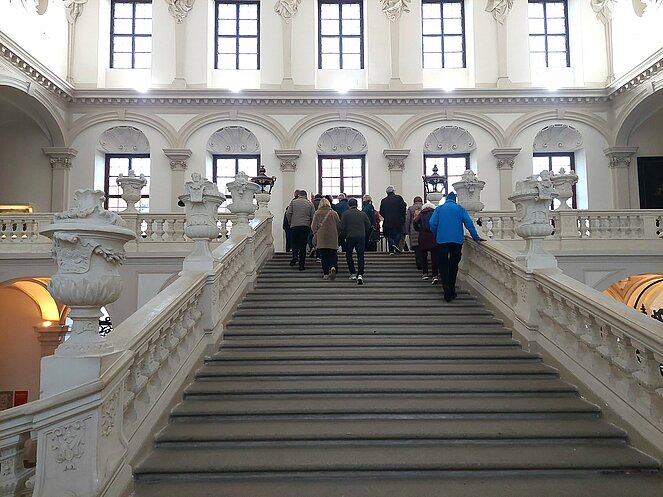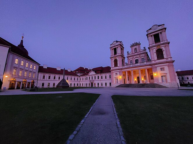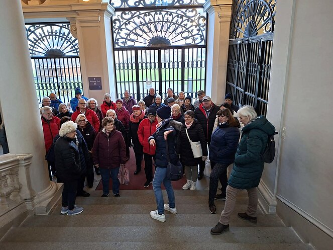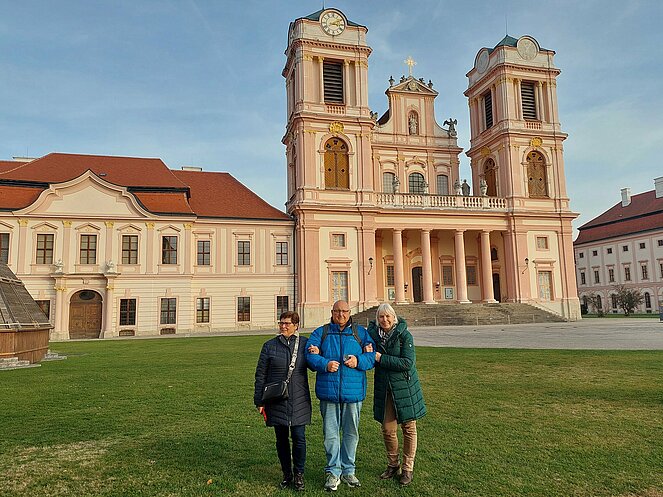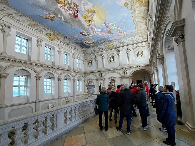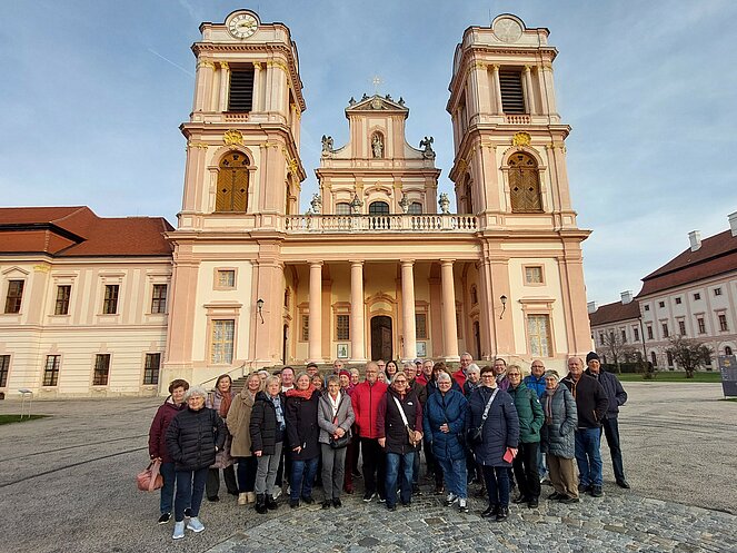 Gestärkt und in bester Stimmung machten wir einen kurzen Spaziergang durch das sonnige Straßertal, bevor es weiter zum Benediktinerstift Göttweig ging. Schon von weitem beeindruckte das majestätische Kloster auf dem Göttweiger Berg. Ein Teil der Gruppe entschied sich für eine selbstständige Besichtigung, während 36 Personen eine Führung vor der imposanten Stiftskirche starteten. Nach einer kurzen Einführung in die Geschichte des Klosters durften wir in der Klosterkirche den prachtvollen barocken Hochaltar sowie die wunderschöne Orgel bestaunen. Im anschließenden Museumsbesuch führte uns der Weg über die monumentale Kaiserstiege, deren beeindruckende Deckenfresken besonders hervorgehoben wurden. Im Kaisertrakt bewunderten wir einen der schönsten Räume des Stiftes.