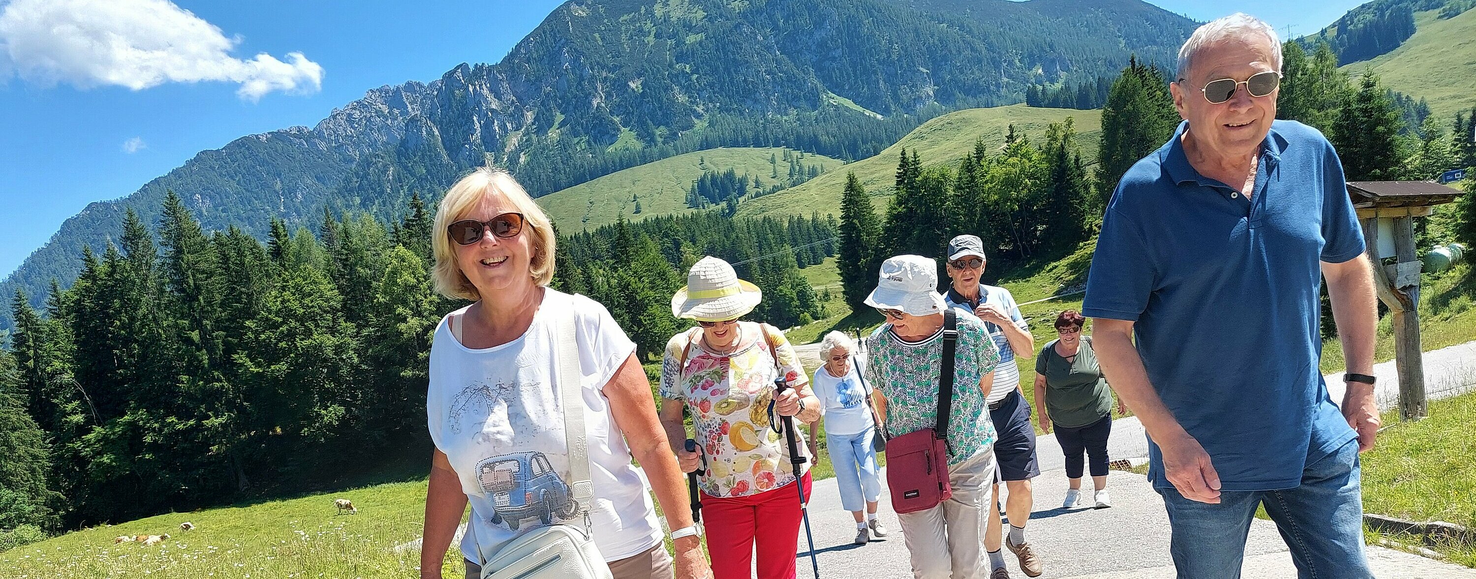 Nach dem Mittagessen beim „Vieh Heli“ ging es am Hallstätter See vorbei und den Pass Gschütt hinauf zur Postalm. Gosaukamm, Dachstein-Gletscher, Bischofsmütze - all‘ das konnte man bei der Fahrt durch das Lammertal bei ausgezeichneter Fernsicht bestaunen. Auf der Postalm verteilten wir uns auf verschiedene Hütten, da es für längere Spaziergänge heute einfach zu heiß war. Bei der Rückfahrt ging es vorbei am Wolfgangsee zum Mondsee auf eine kleine Eispause. Mit einer Fahrt entlang des Attersees beendeten wir unsere Seen-Rundfahrt.