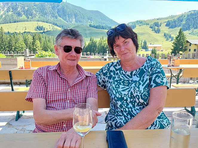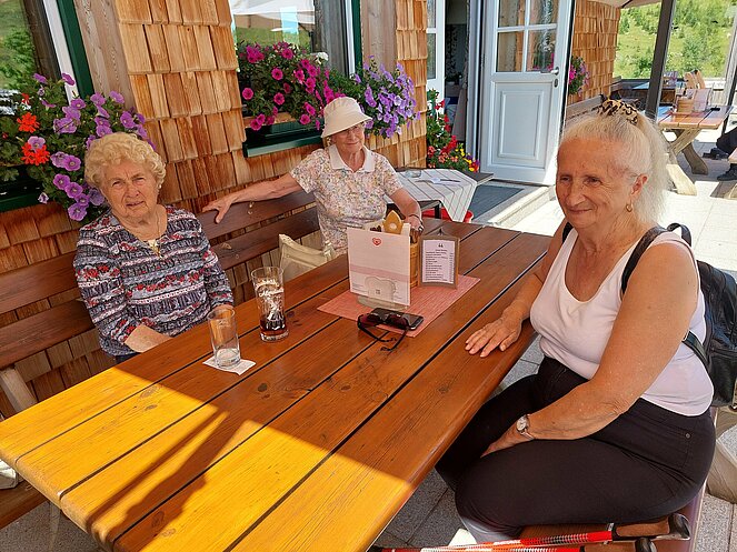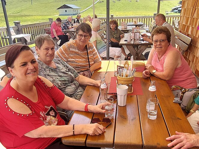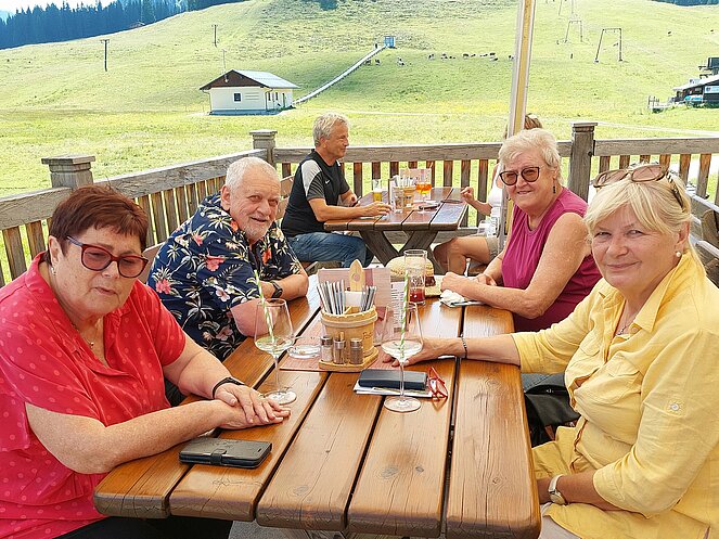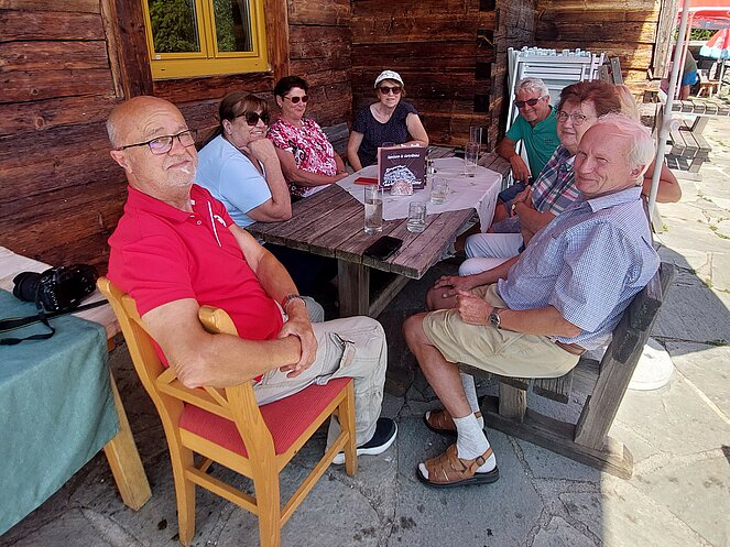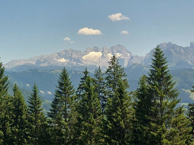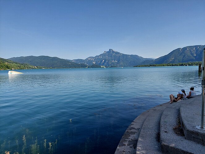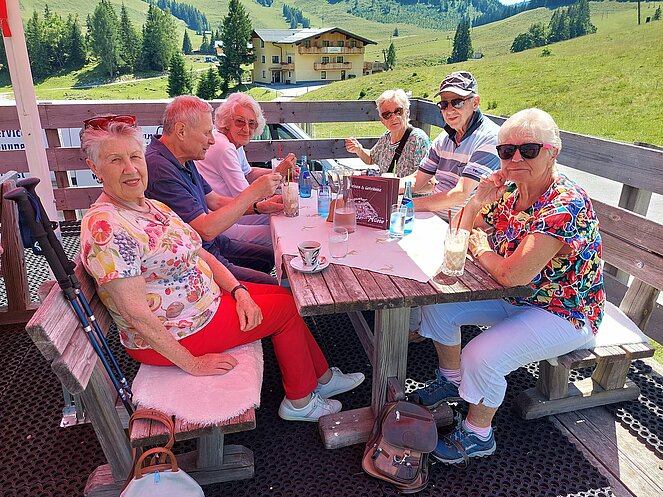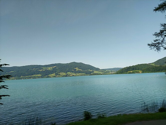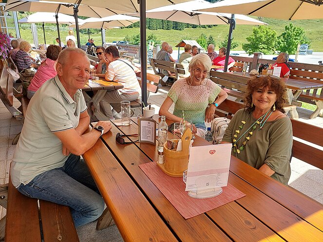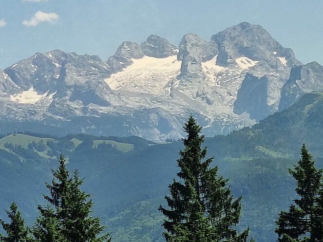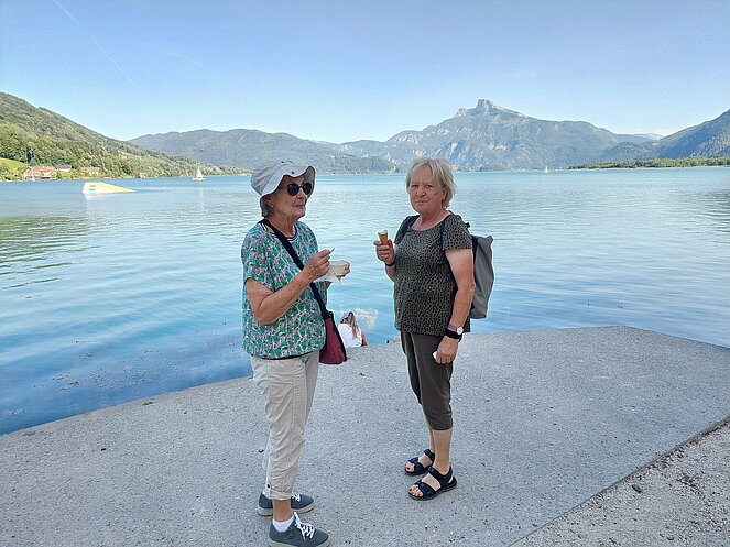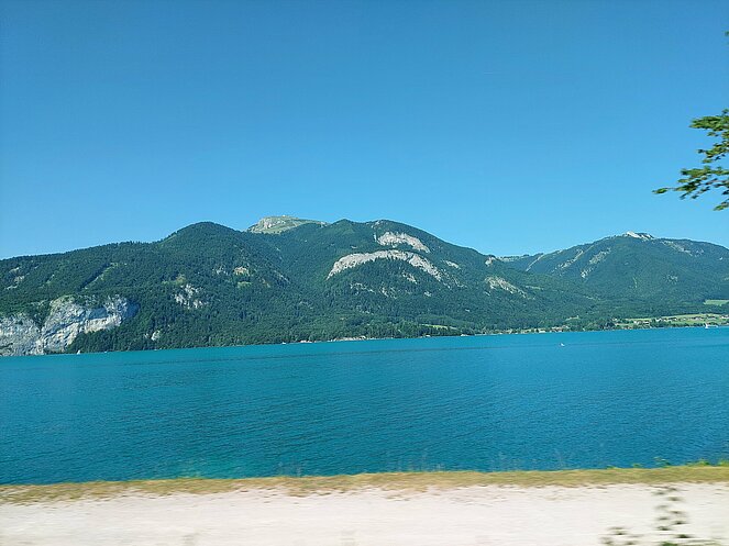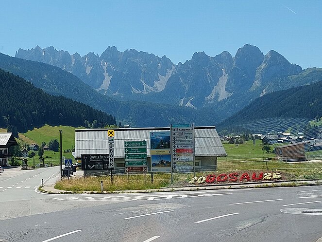 Nach dem Mittagessen beim „Vieh Heli“ ging es am Hallstätter See vorbei und den Pass Gschütt hinauf zur Postalm. Gosaukamm, Dachstein-Gletscher, Bischofsmütze - all‘ das konnte man bei der Fahrt durch das Lammertal bei ausgezeichneter Fernsicht bestaunen. Auf der Postalm verteilten wir uns auf verschiedene Hütten, da es für längere Spaziergänge heute einfach zu heiß war. Bei der Rückfahrt ging es vorbei am Wolfgangsee zum Mondsee auf eine kleine Eispause. Mit einer Fahrt entlang des Attersees beendeten wir unsere Seen-Rundfahrt.