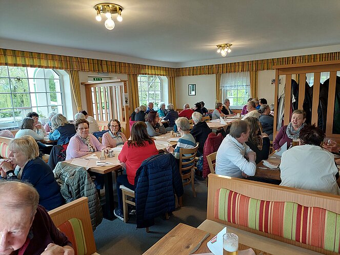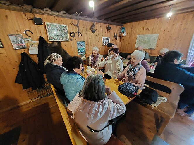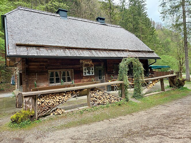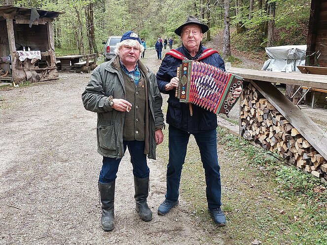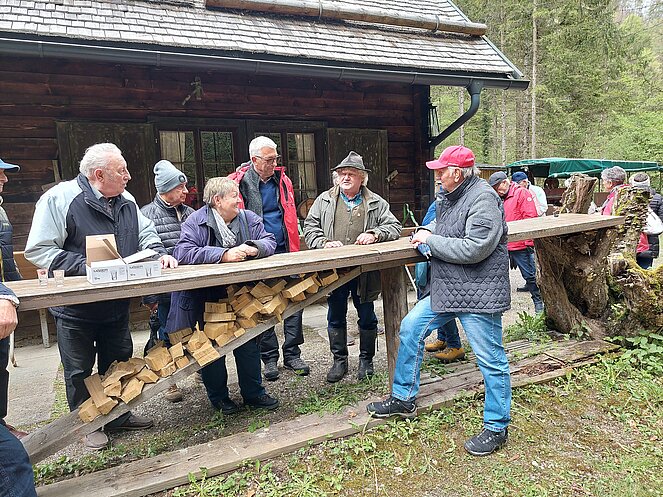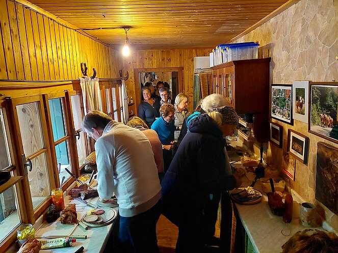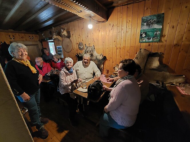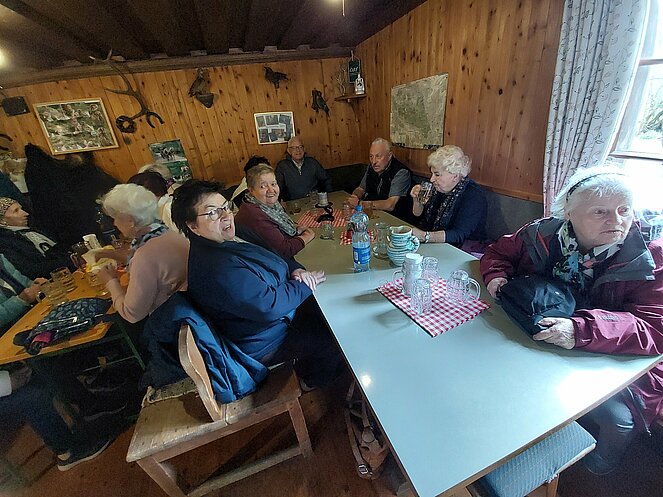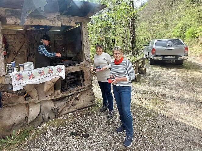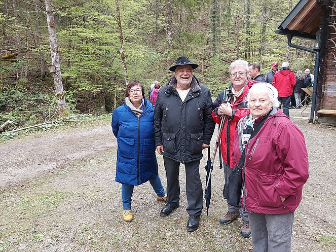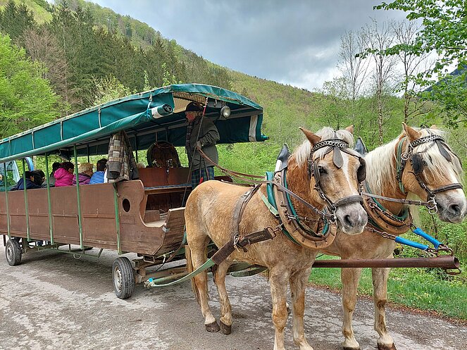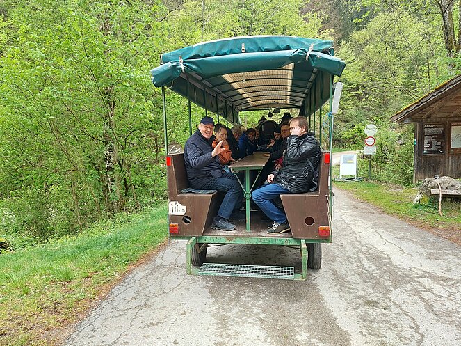 In Reichraming wurden wir bereits von unserem Hintergebirgskutscher Michael Schwarzlmüller mit seinem Pferdegespann erwartet. Die Hälfte der Teilnehmer wechselte auf die Kutsche und der Rest genoss die wunderschöne Landschaft bei ausgezeichnetem Wanderwetter durch das Weißenbachtal. Bei der Bergwieshütte erwartete uns ein Begrüßungstrunk und eine richtige Bauernjause. Die traditionellen Holzknechtnocken wurden auf einem Feuer im Freien gebraten und teilweise gleich vor Ort verkostet. Unser Hüttenwirt erzählte immer wieder lustige Anekdoten und sorgte für sehr gute Stimmung. Um 14:00 Uhr mussten wir leider den Rückweg zum Bus antreten – in dieser wunderschönen Landschaft hätten wir gerne noch länger verweilt. Zum Abschluss besuchten wir noch den Rieglwirt in Garsten, um uns noch kurz für die Heimfahrt zu stärken.