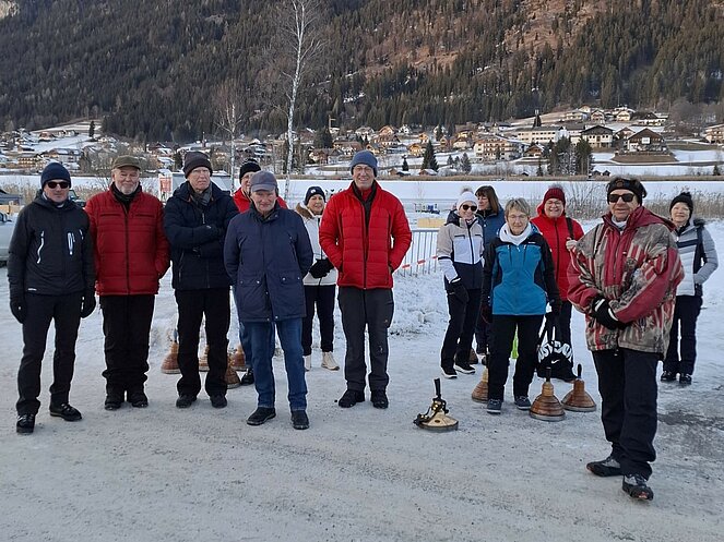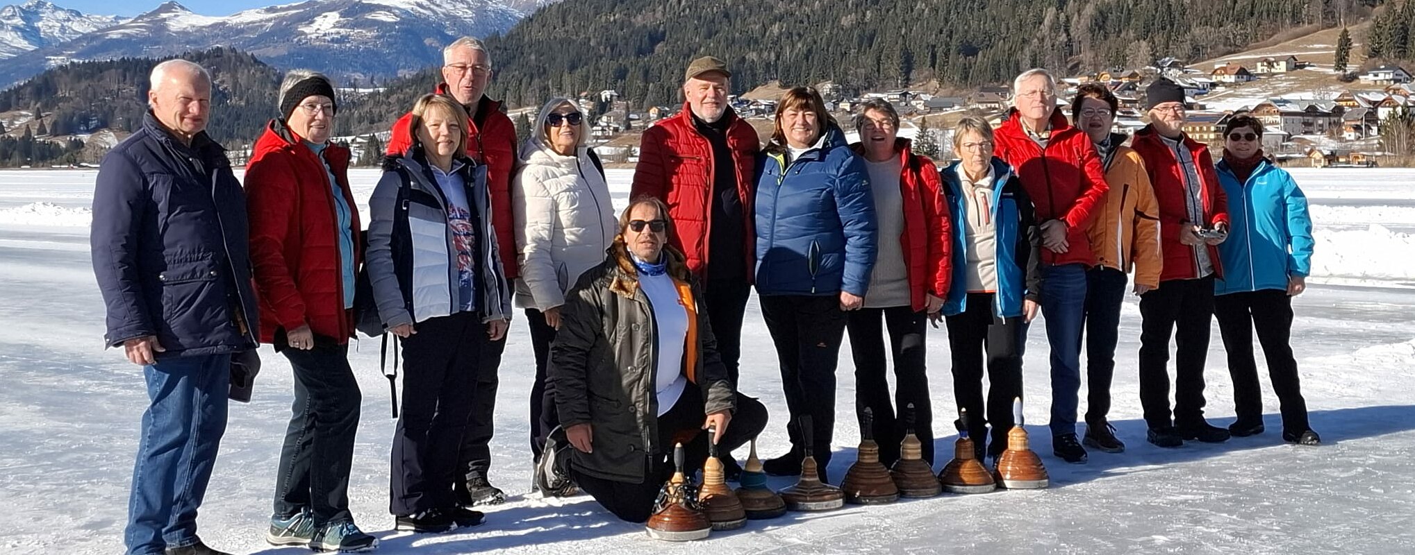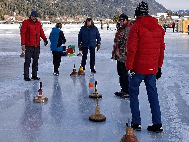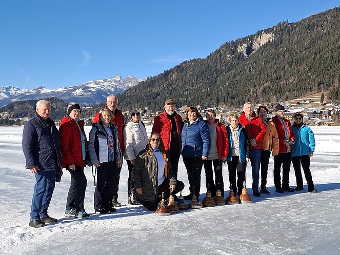 Gut gelaunt starteten wir danach mit dem Naturpark-Shuttle Richtung Eisfläche, wo das erste Highlight des Tages auf uns wartete: das Stockschießen. Bei strahlendem Sonnenschein und umgeben von der beeindruckenden Kulisse des Weißensees war die Stimmung in der Gruppe hervorragend.