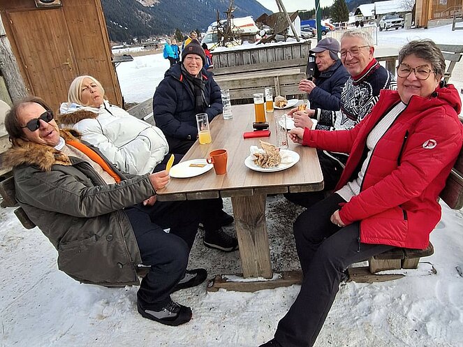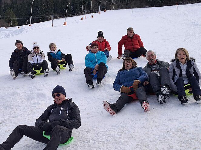Auch der zweite Tag begann sportlich: Bereits um 9:30 Uhr fuhren wir erneut zum Stockschießen auf die Eisfläche. Das Mittagessen konnten wir in der Tschatscheleria direkt am Weißensee genießen. Im Anschluss bot sich uns die Gelegenheit, etwas Neues auszuprobieren: Gemeinsam testeten wir Rutschteller - mit viel Begeisterung und einer ganzen Menge Spaß.