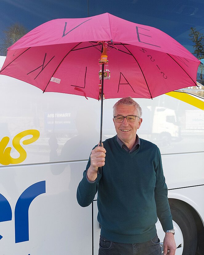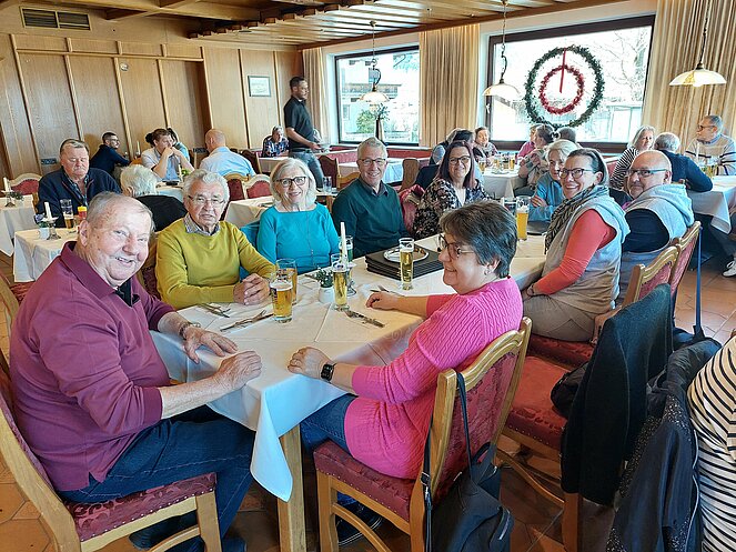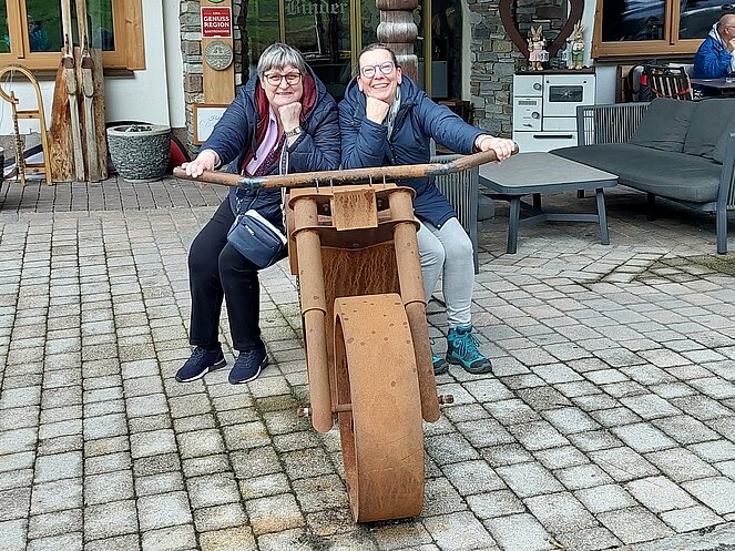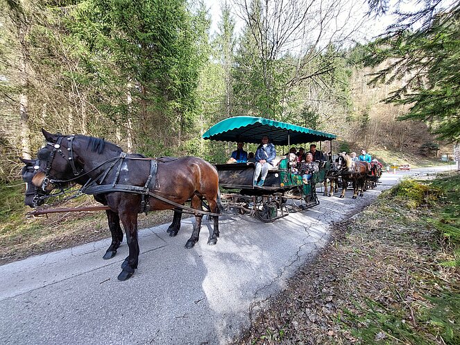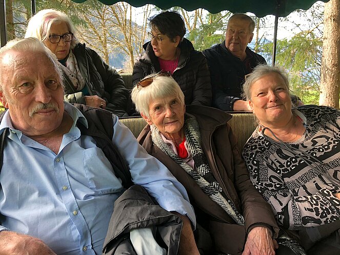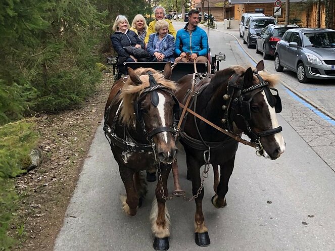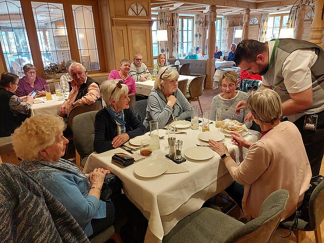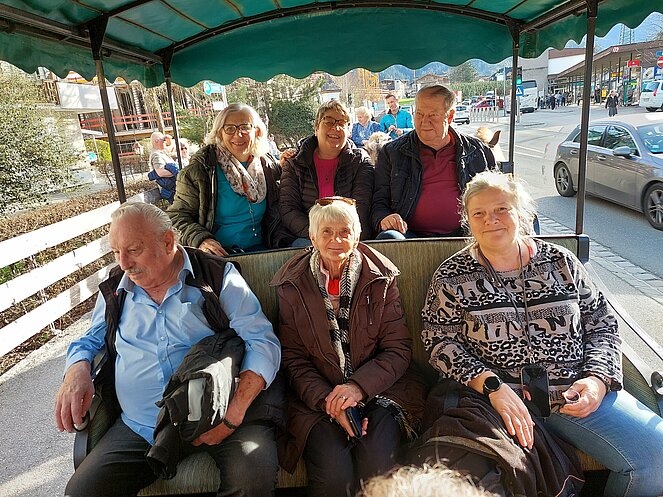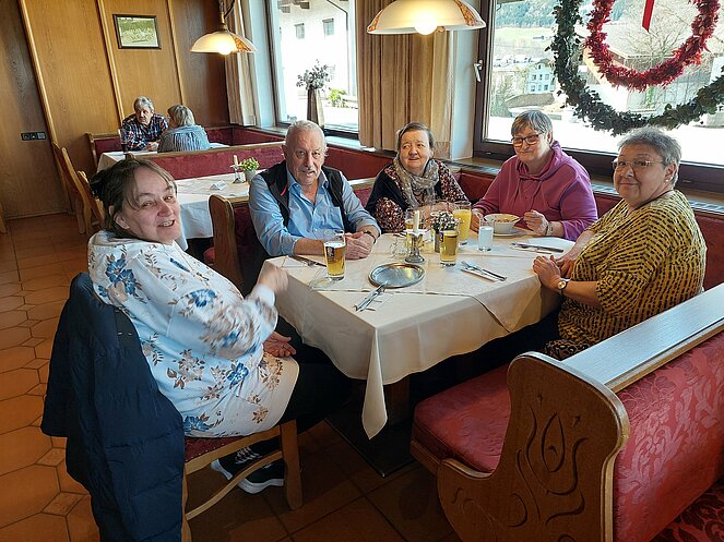 Gleich zu Beginn bekam der Reiseleiter Manfred Fadl von unserer Karin Weiß einen roten Regenschirm, den sie selbst beschriftet hat, überreicht. Im Laufe der Reise war er immer wieder im Einsatz - eine tolle Idee. Unser erstes Ziel war das Giessweinwerk in Brixlegg und einige unserer Reiseteilnehmer wurden auch gleich fündig. Beim anschließenden Mittagessen beim Bucherwirt staunten wir alle über die ausgezeichnete Küche. Von Jenbach fuhren wir mit der Zillertalbahn durch das schöne Zillertal nach Mayrhofen, wo uns am Bahnhof schon zwei Pferdekutschen erwarteten. Ein Teil unserer Gruppe entschied sich für einen Spaziergang oder eine Kaffeepause. 22 Personen teilten sich die Kutschen und genossen im Sonnenschein die schönen Bauten und Landschaften. Als Zusatz gab es ein wunschschön verschneites Berg-Panorama. Vollkommen zufrieden fuhren wir zu unserem Hotel - dem Dörflwirt in Hainzenberg. Nach dem Abendessen ging es hinunter zur Kegelbahn und auch Tischfußball und Billard wurden ausprobiert - wir sind an allem interessiert.