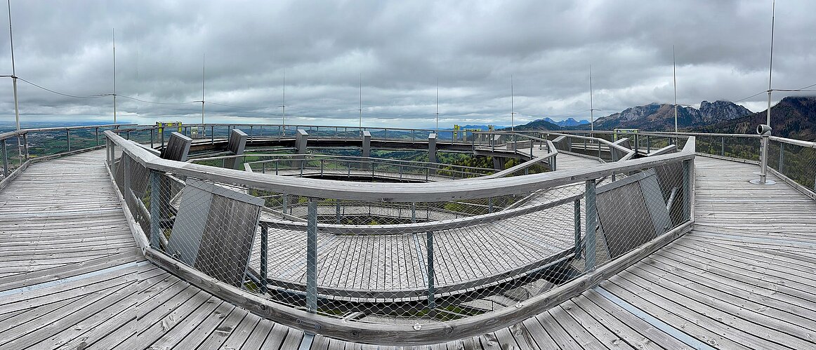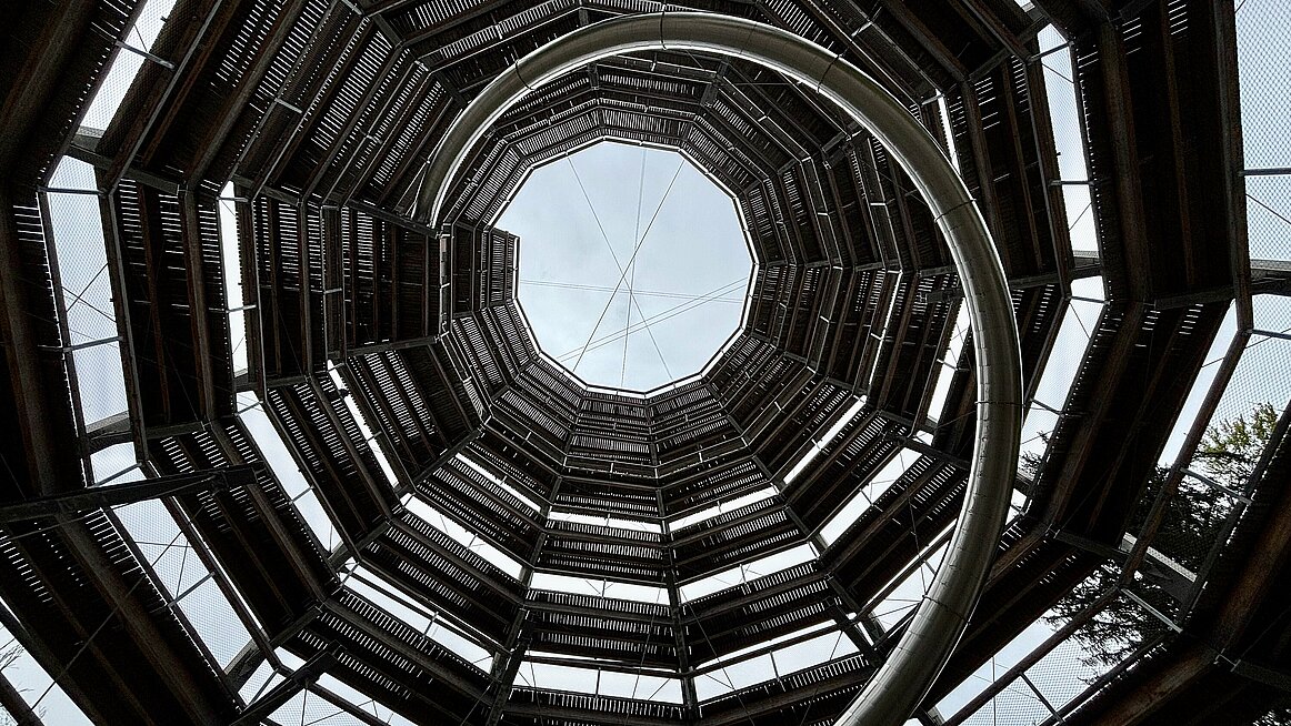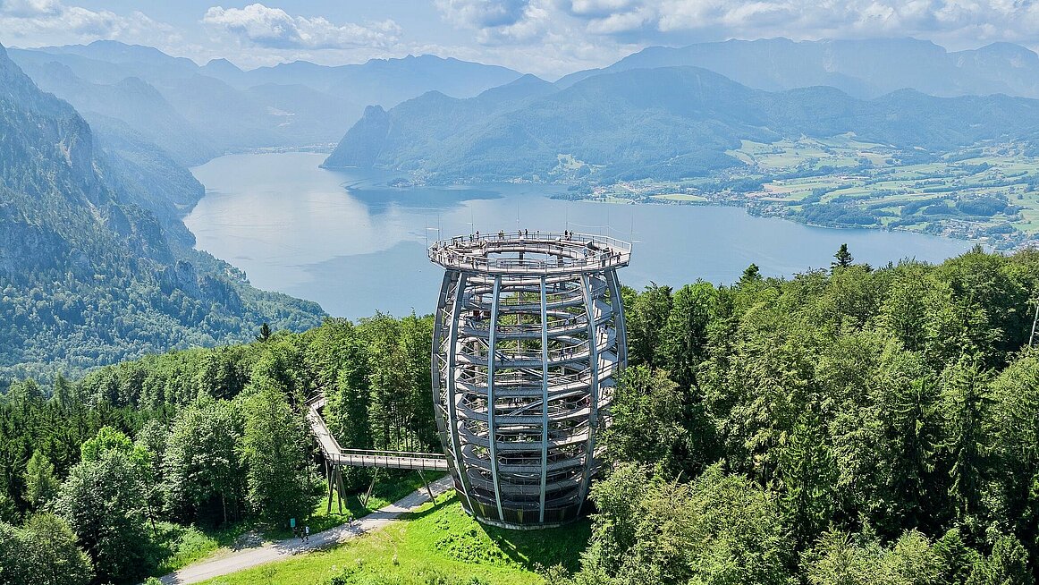 Danach nutzten einige den Verdauungsspaziergang über den Salzkammergut Baumwipfelpfad. Der 39 Meter hohe Aussichtsturm erinnerte nicht nur in Form an ein riesiges Salzfass – einige meinten auch, der Aufstieg erinnere an das Öffnen eines gut gefüllten Vorratsschrankes: Runde um Runde, immer neue Eindrücke, bis man oben die ganze Region bewundern konnte. Atemberaubend – wortwörtlich!
