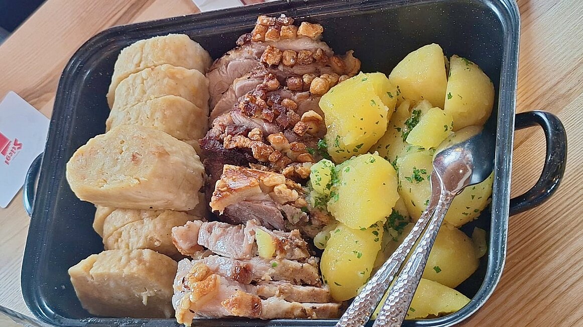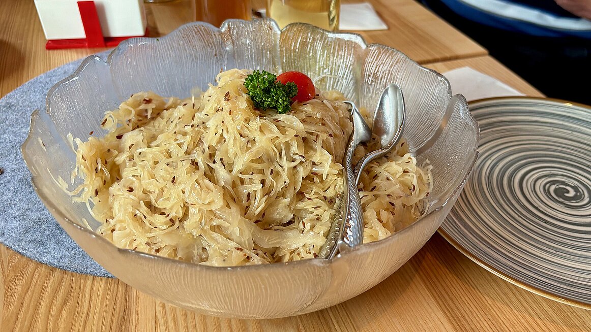 Oben wartete schon die Grünbergalm, wo ein köstliches Brat’l in der Rein mit warmem Krautsalat serviert wurde. Und als ob das nicht schon reicht – dazu gab’s gute Gespräche, jede Menge Lachen und das eine oder andere Schnapserl für die Verdauung.
