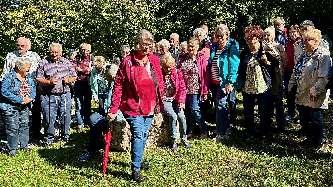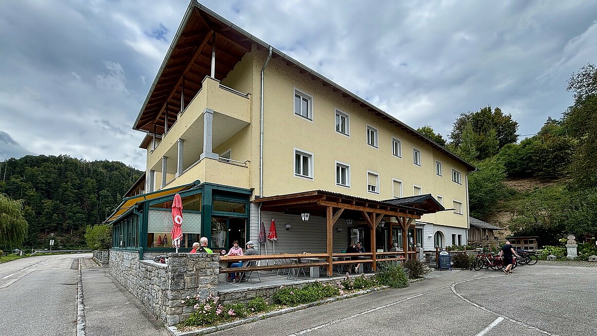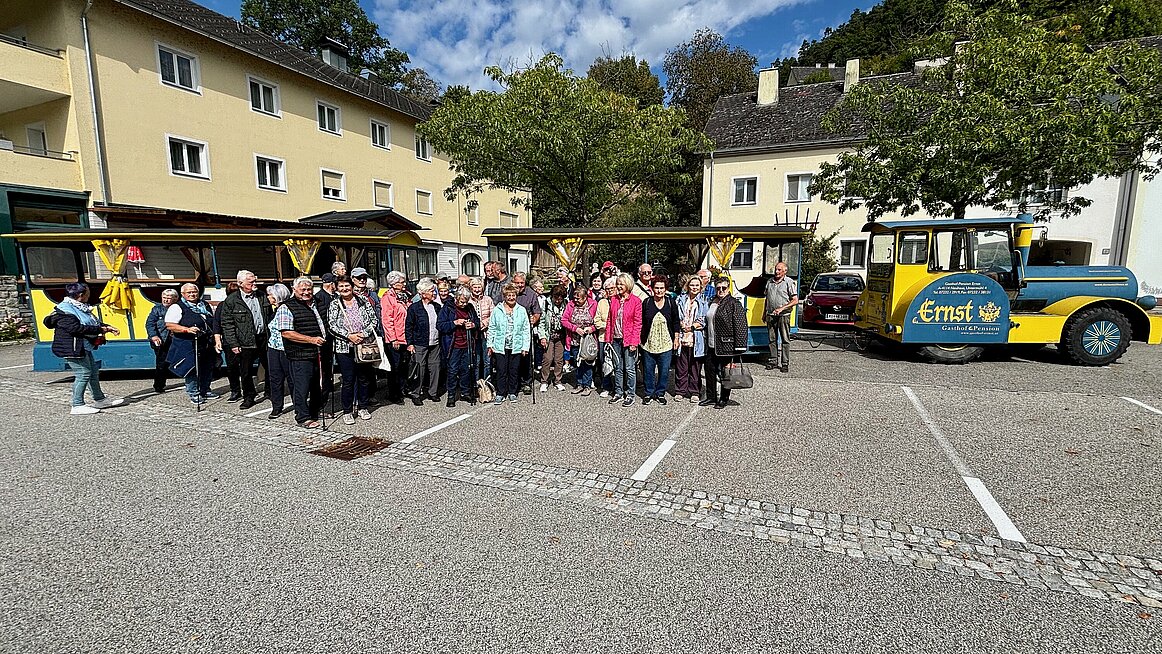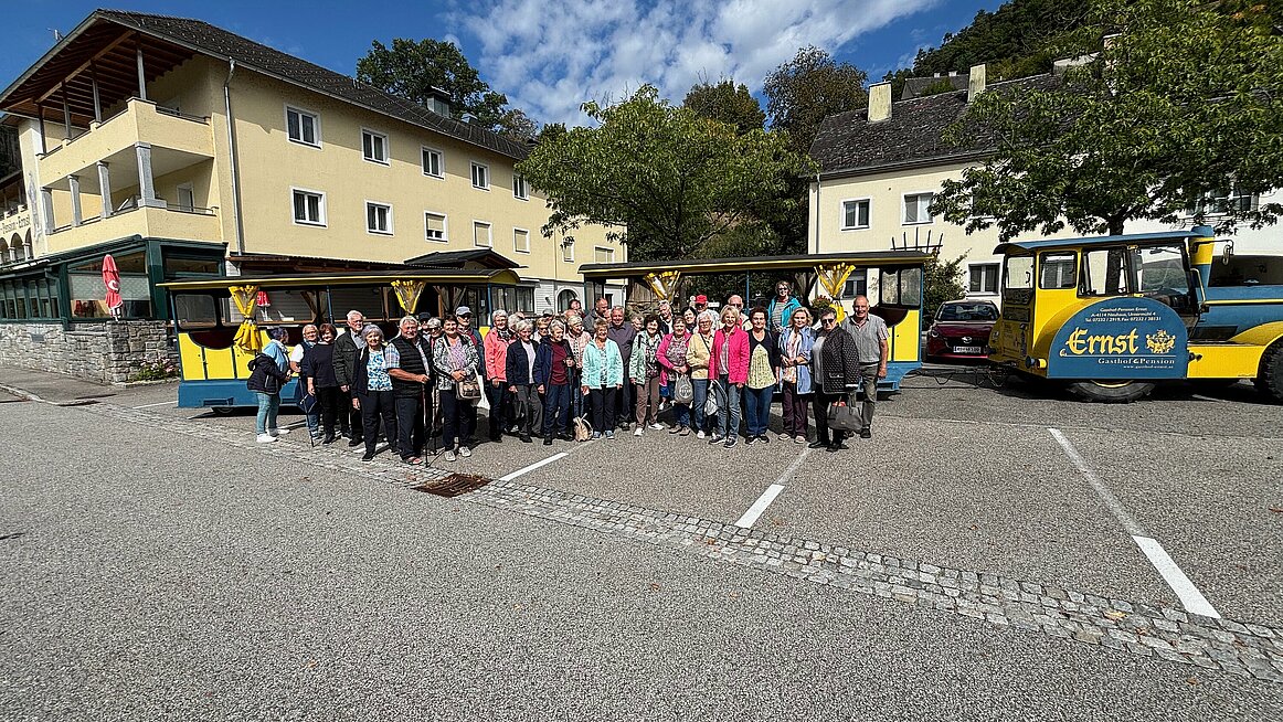 Nach so viel harter Steinkunde ging es bequemer weiter: Der Bummelzug brachte uns über Schloss Neuhaus nach Untermühl, wo wir im Landhotel Ernst einkehren durften. Ein Gasthaus, das seit 1594 (!) besteht – also deutlich länger als so manche Regierungskoalition. Das Mittagessen war köstlich, die Portionen reichlich – und ja, wir haben bewusst etwas mehr konsumiert, um die angeschlagene Gastronomie zu unterstützen. Wir wollen ja nicht, dass die Wirte genauso ausgedünnt werden wie unsere Pensionen.